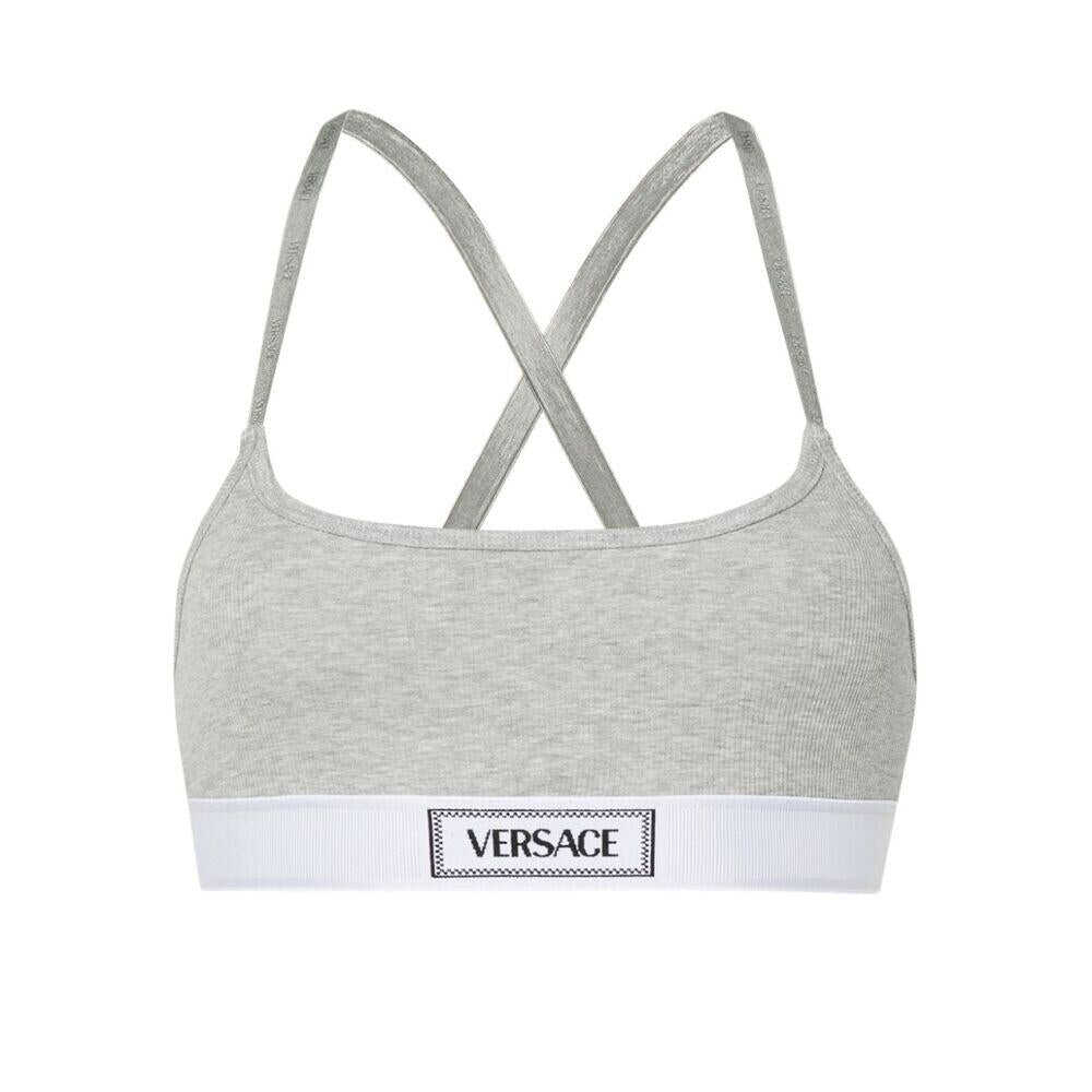Light grey cotton blend stretch-design jersey texture scoop neck adjustable rear criss-cross straps logo-jacquard underband elasticated underband pull-on style
