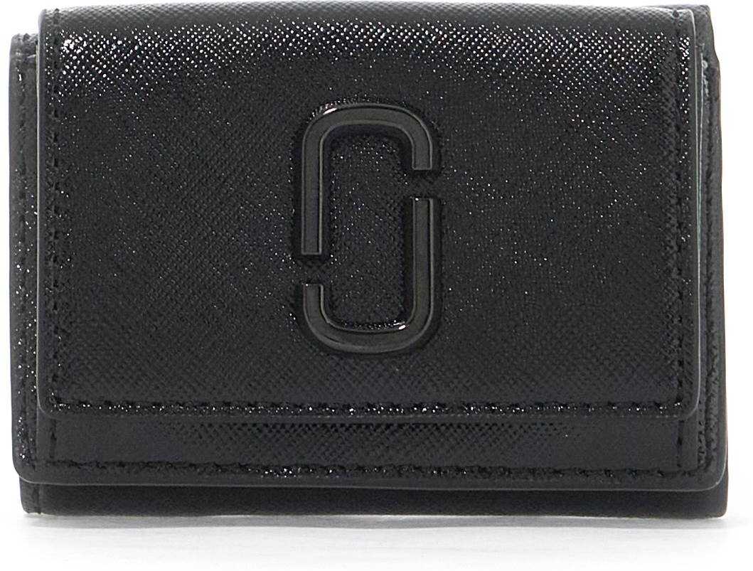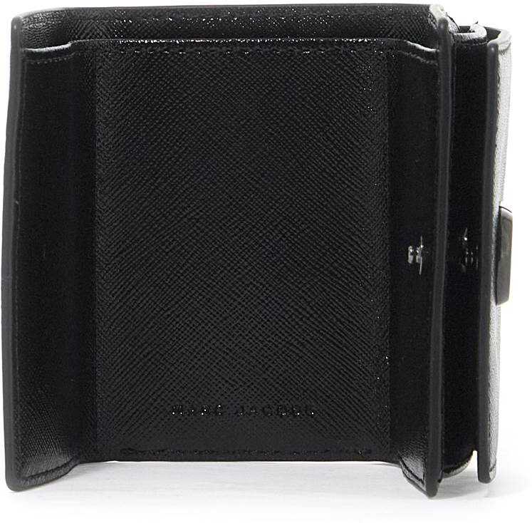 The Utility Snapshot DTM Mini Trifold Wallet by Marc Jacobs is made of glossy saffiano leather with the iconic tone-on-tone J Marc logo on the front. It features a snap button closure, one coin compartment, one bill compartment, and an external slip pocket. The interior is lined with faille fabric for a luxurious touch.