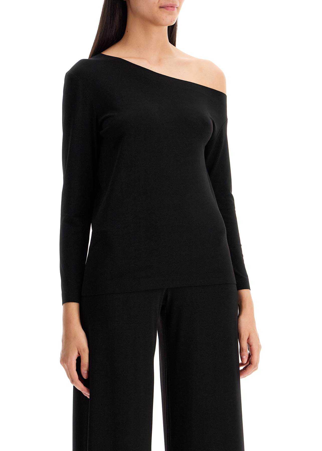 Norma Kamali presents a long-sleeved lycra top with a fluid and comfortable fit, featuring an asymmetrical neckline that leaves one shoulder bare. The essential design is highlighted by laser-cut edges. The model is 177 cm tall and wears size XS.