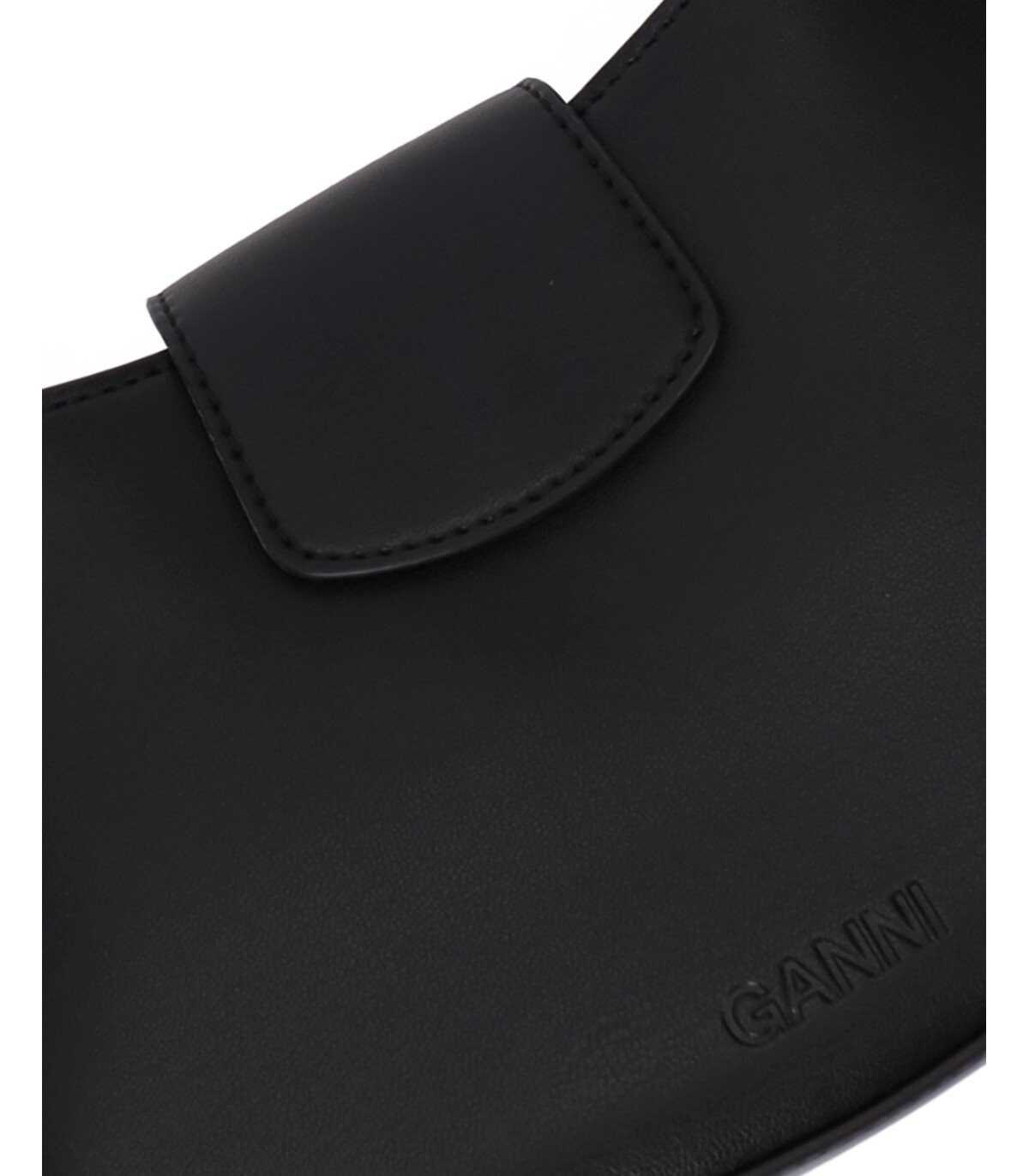 Mini bag by Ganni made of black recycled leather. Golden hardware, decorative chain with logo details and side charms. Magnetic flap closure, adjustable and removable shoulder strap. Measurements 22x13x4 cm.