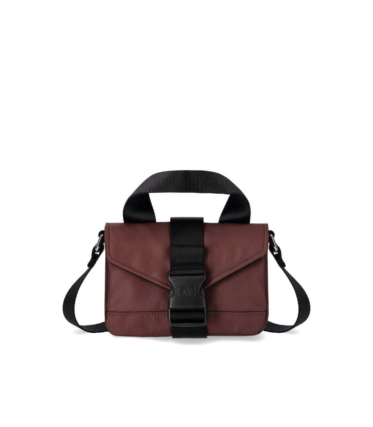 Tech shoulder bag by Ganni made of recycled polyester fabric, waterproof, in chocolate color. Lined interior, buckle closure and strap with logo. Adjustable shoulder strap, measures 20x15x5.5 cm.