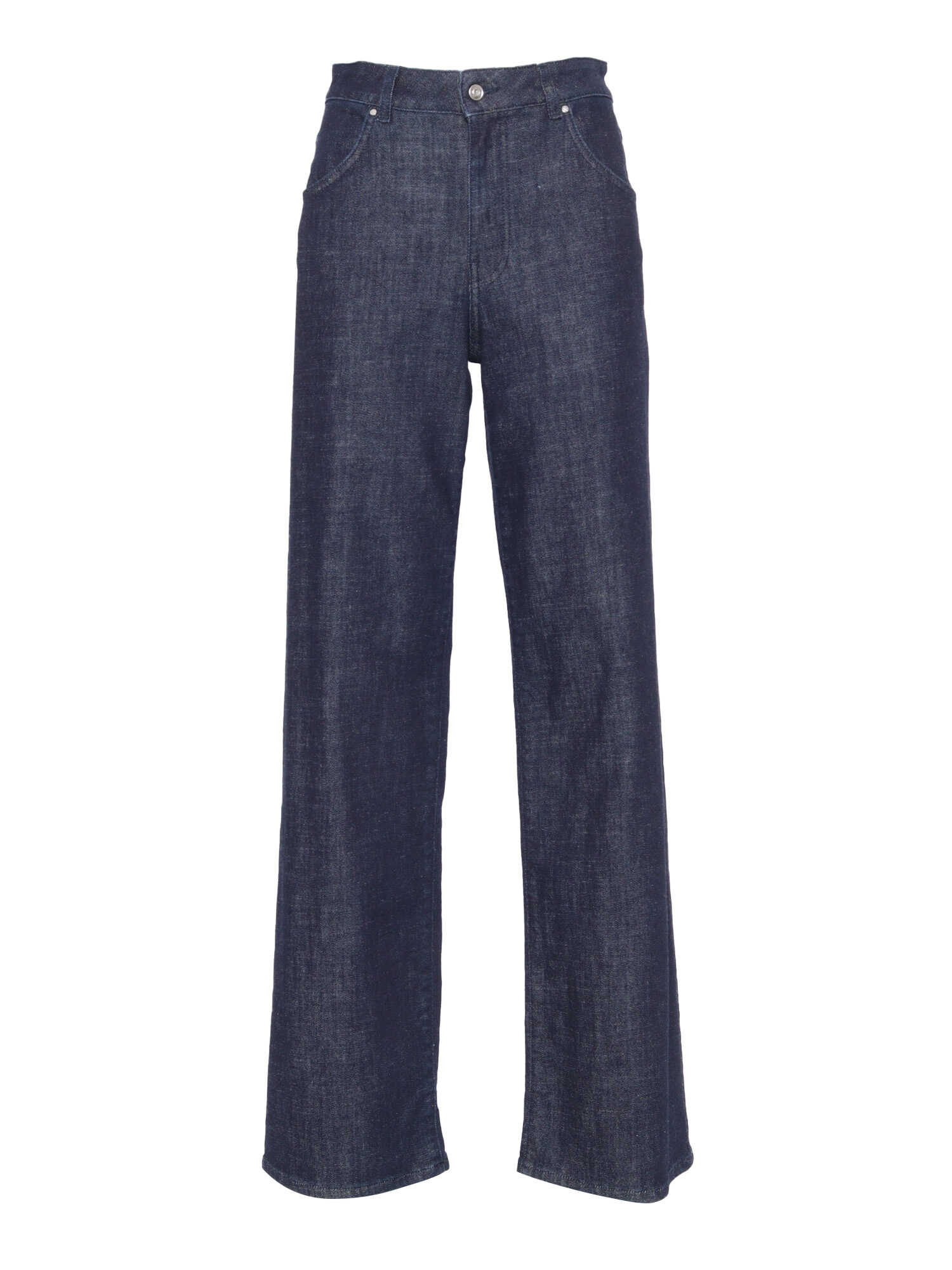 Soft straight-leg denim trousers with welt pockets, button and zip closure.