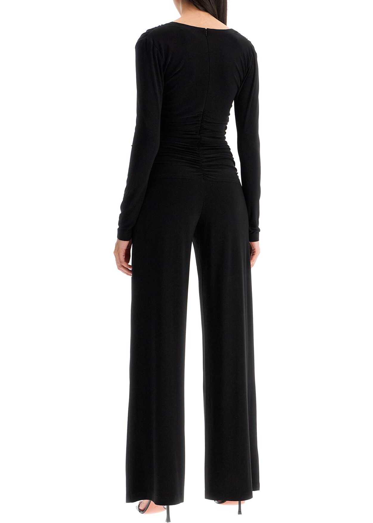 Made from poly lycra for a light and fluid feel, this Norma Kamali jumpsuit features a fitted bodice with long sleeves and wide-leg pants. The crossover neckline and soft gathers at the waist and shoulders enhance the silhouette. Invisible zip closure at the back, laser-cut edges. The model is 177 cm tall and wears size XS.