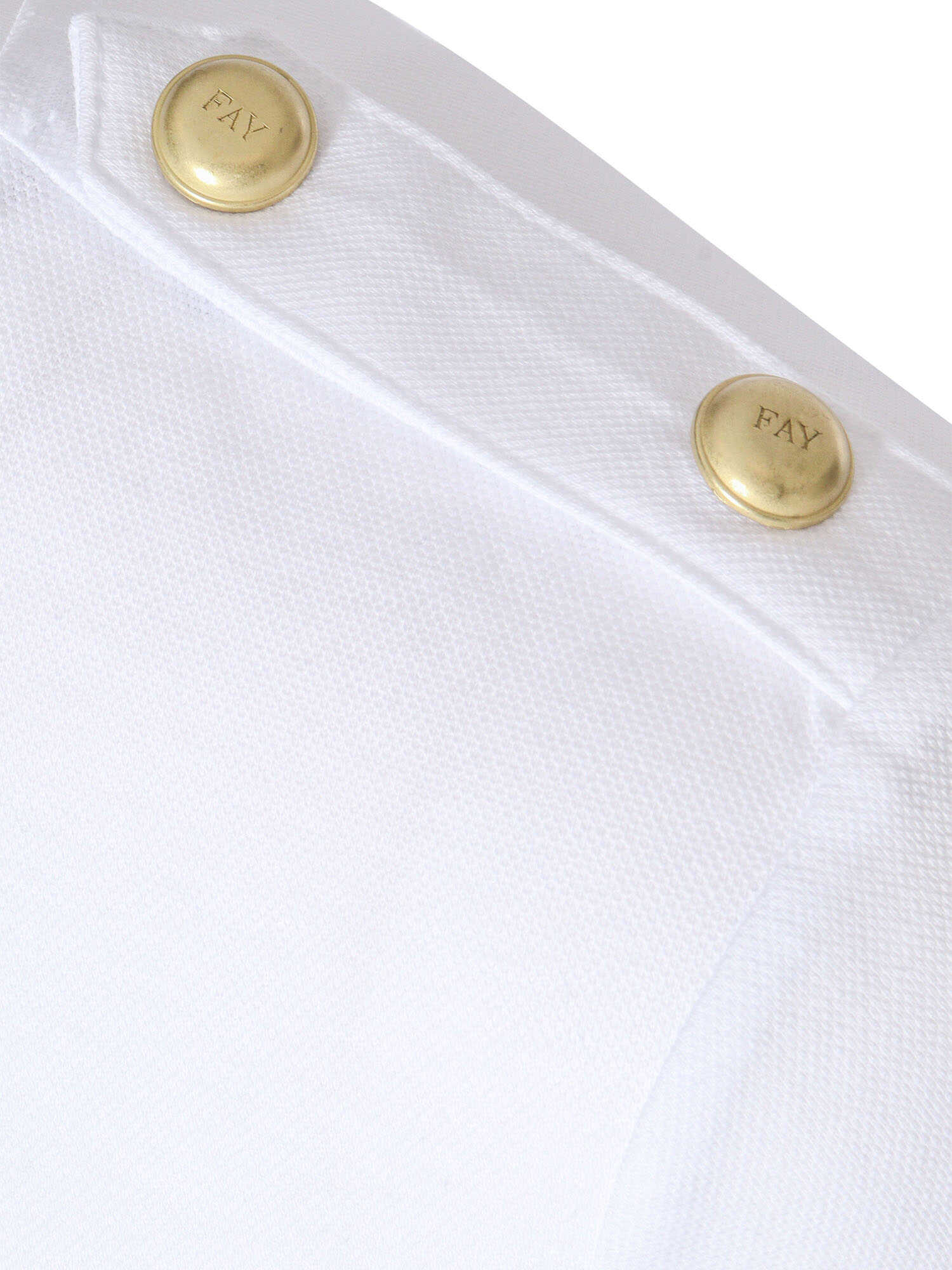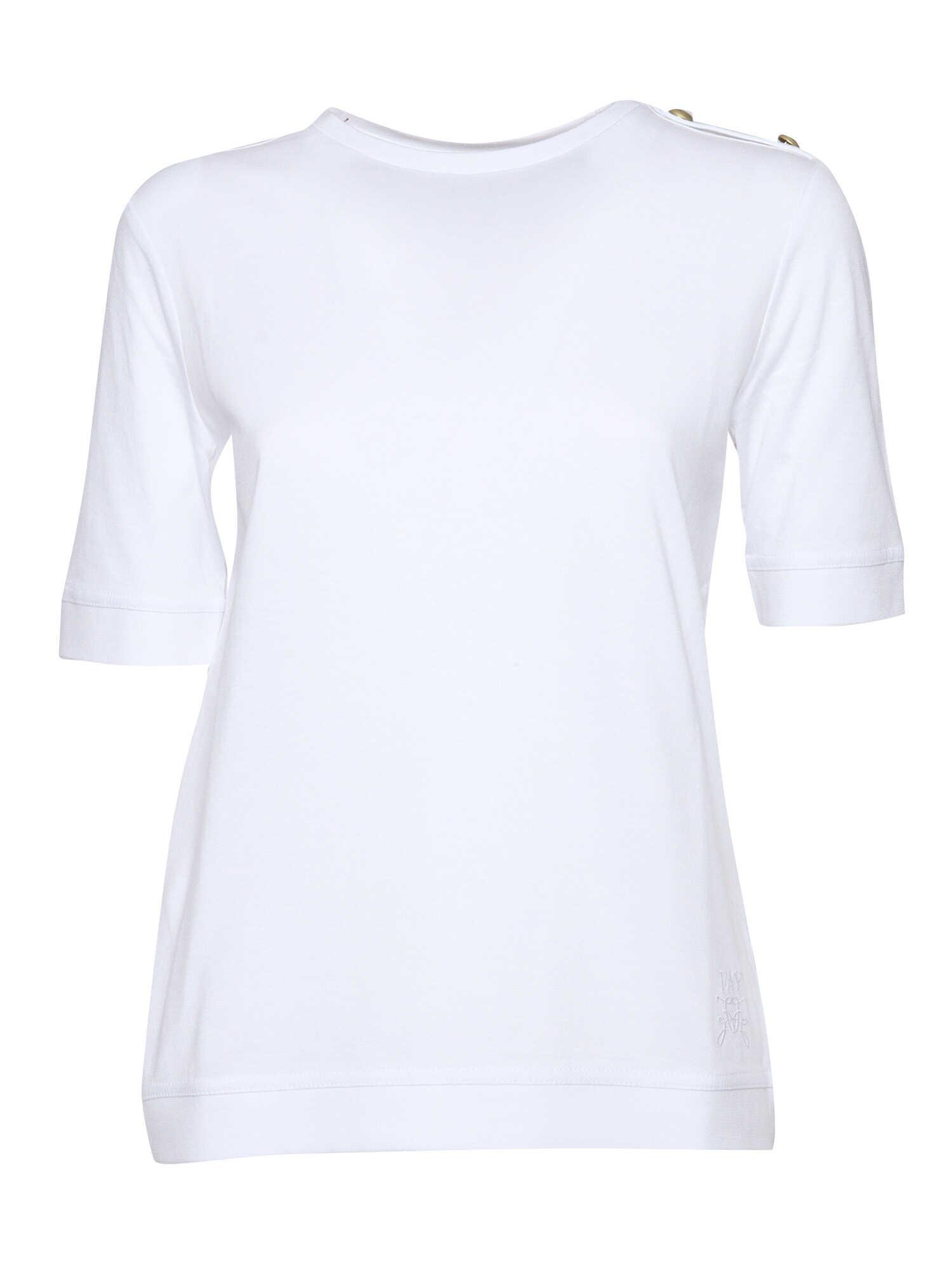 White crew-neck t-shirt in stretch cotton, contrasting gold buttons on the shoulder, slim fit.