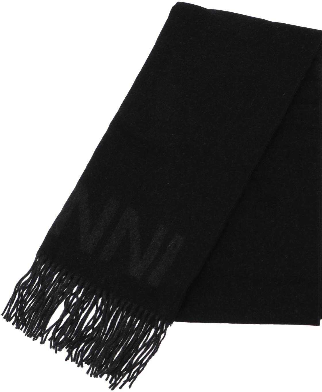 Ganni scarf crafted in recycled-wool blend with jacquard logo lettering, finished with fringed edges.