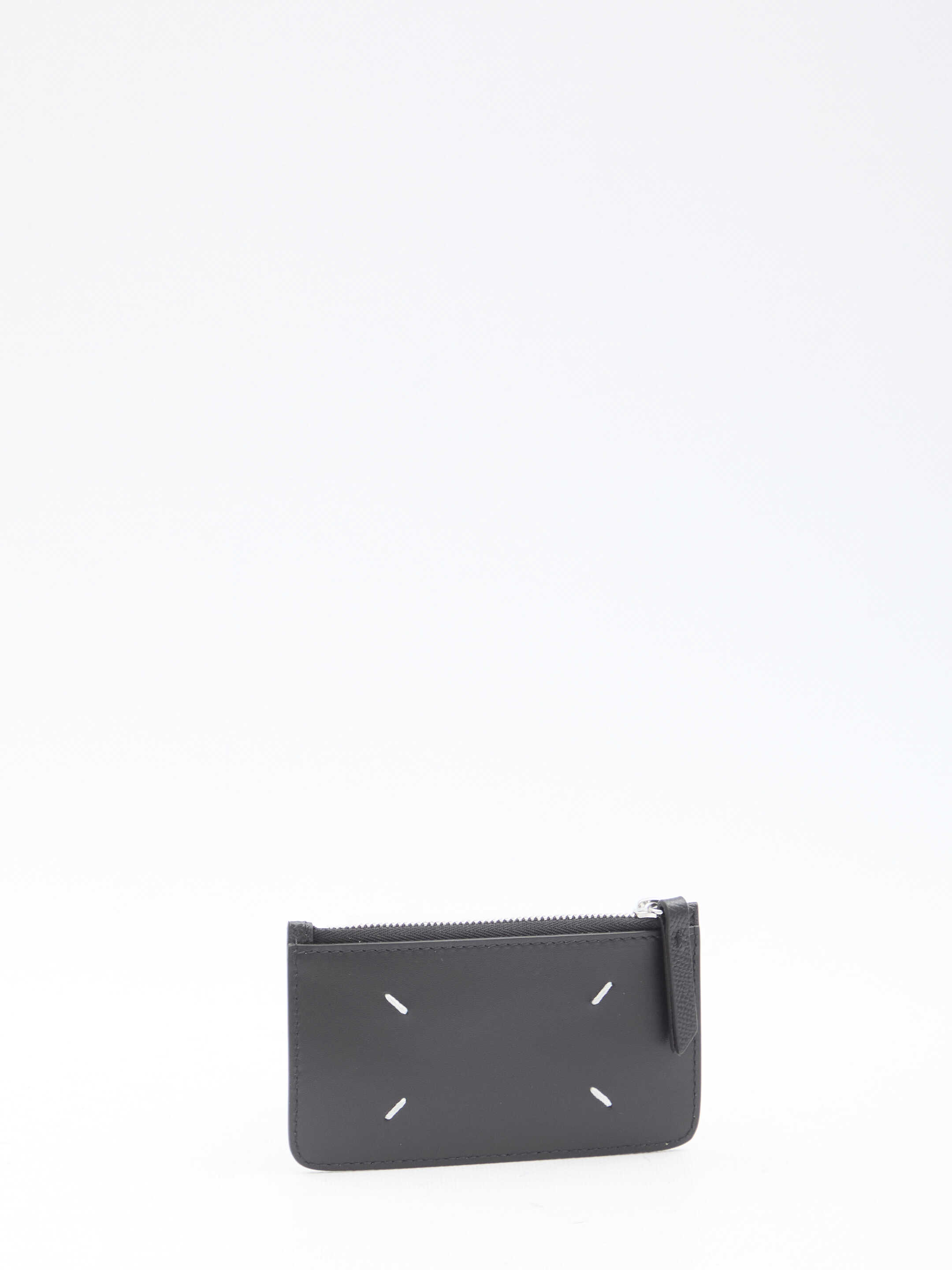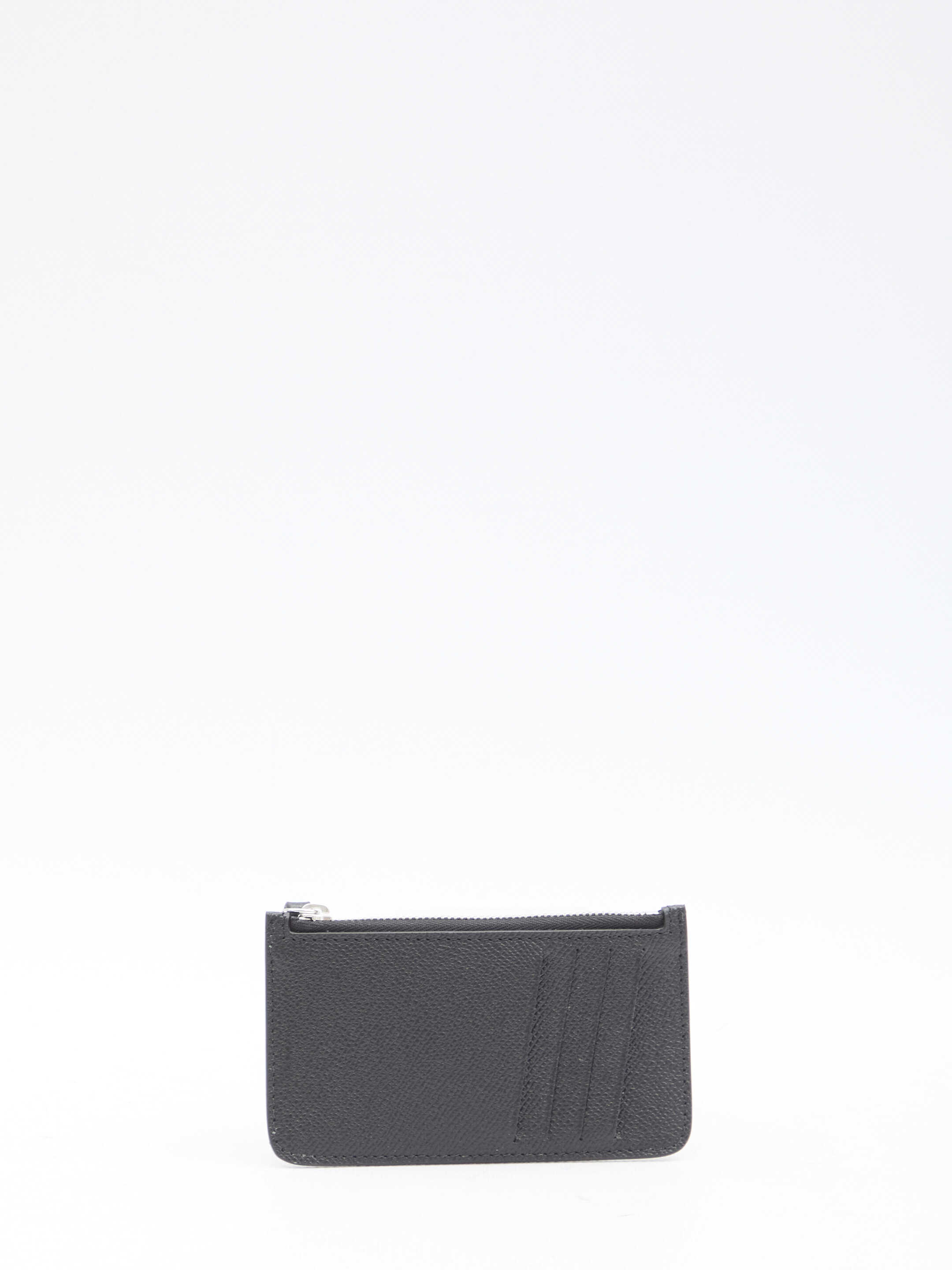 Cardholder in black grained and smooth calfskin with Four Stitches detail. It features zip closure and four card slots. Any leather imperfections are not to be considered manufacturing defects, but a peculiarity of the material.