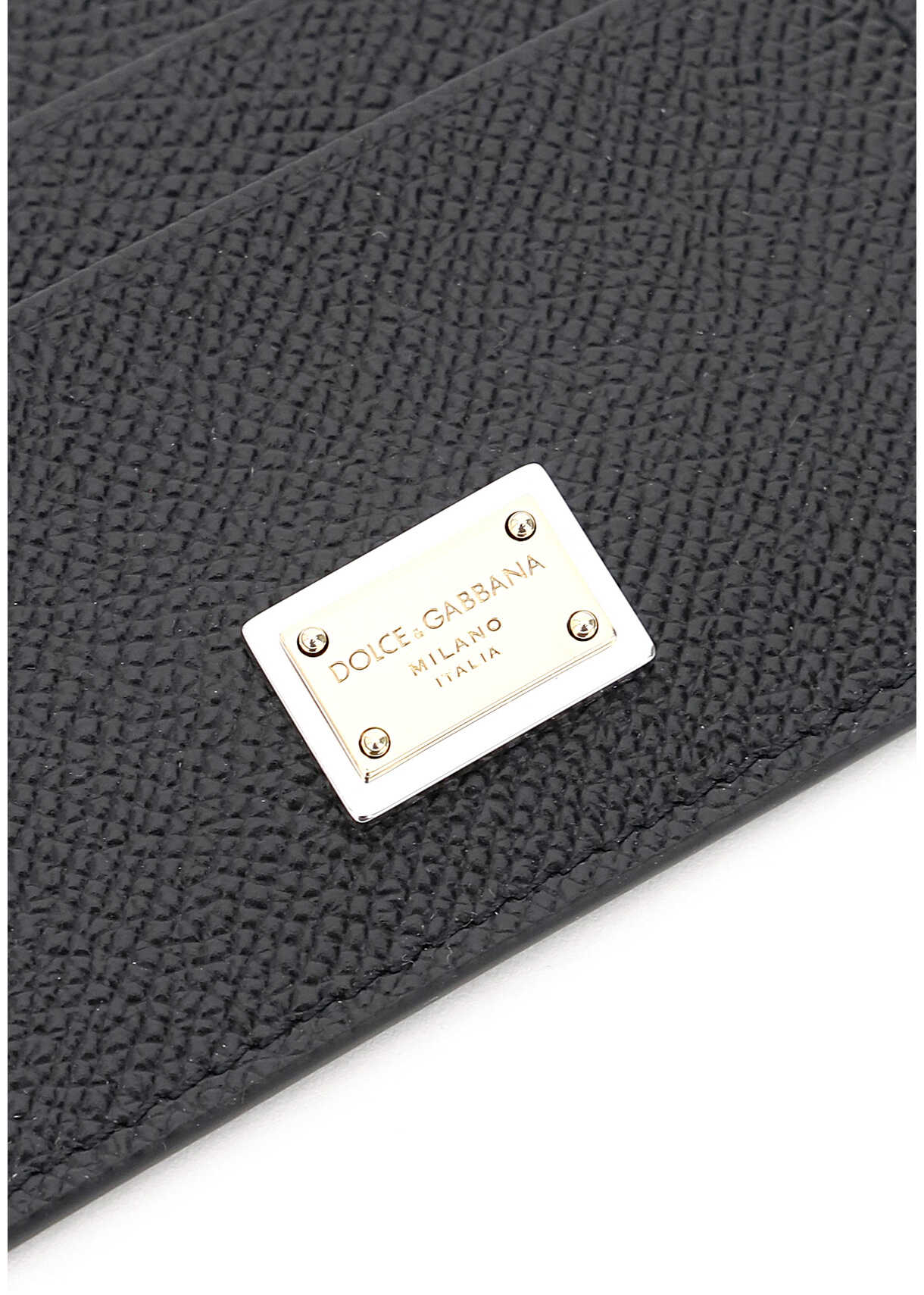 Dolce & Gabbana card holder in Dauphine-printed calfskin featuring four credit card slots, fabric-lined central slit compartment and the iconic metal logo plaque on the front.