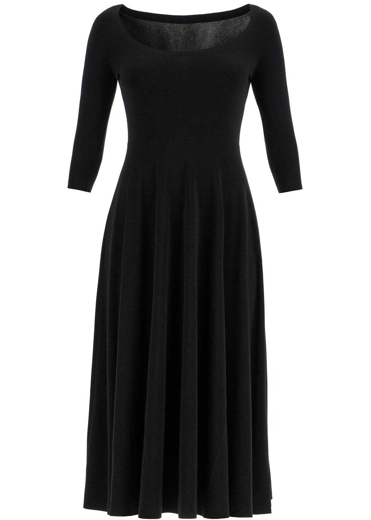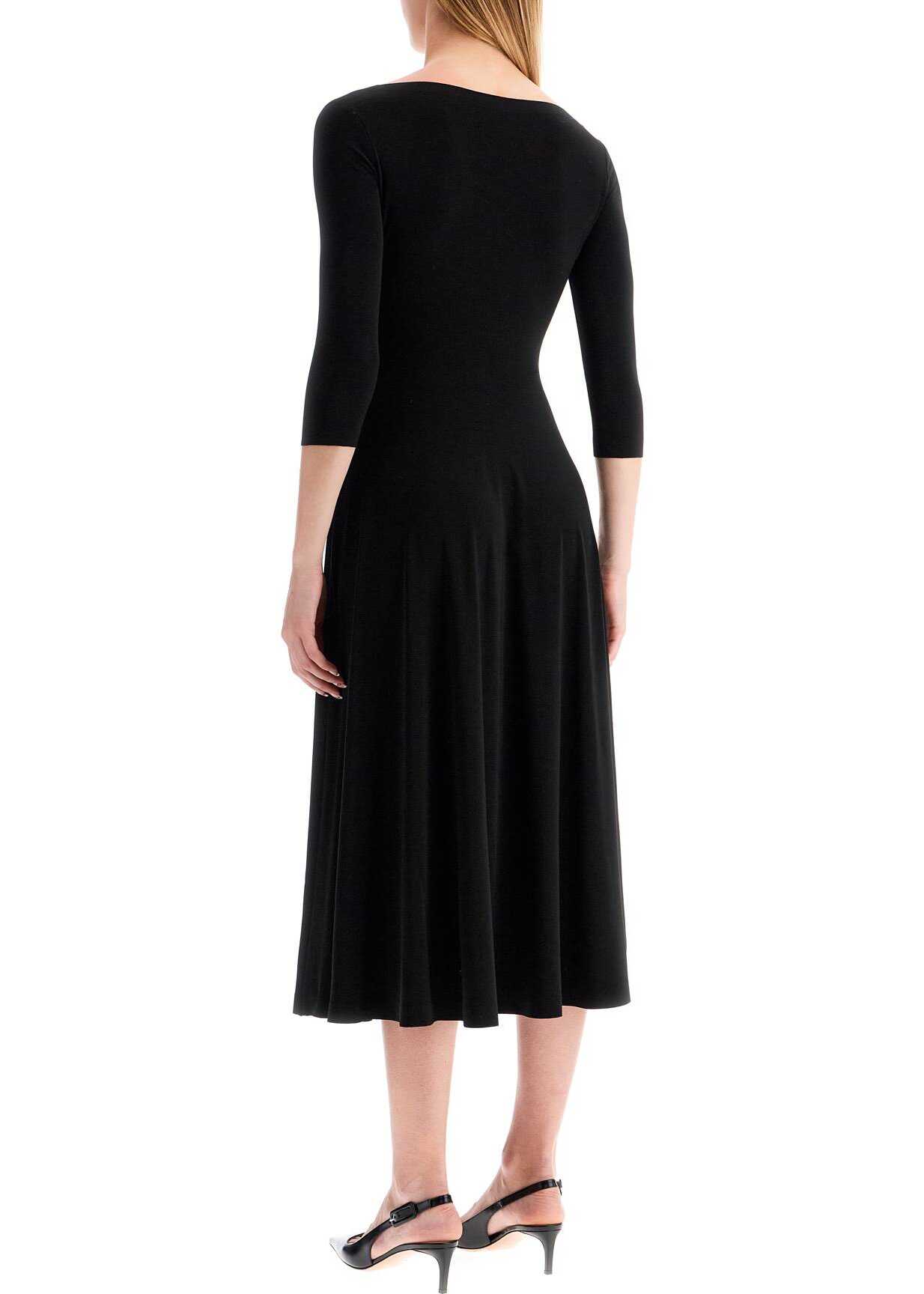 This midi dress by Norma Kamali features a reversible neckline, wide in the front and boat-shaped in the back, allowing for a versatile look. Made of poly lycra, it is comfortable and lightweight, with a fitted bodice complemented by three-quarter sleeves and a flared skirt. The clean lines and laser-cut edges highlight the minimalist aesthetic of the piece. The model is 177 cm tall and wears size XS.