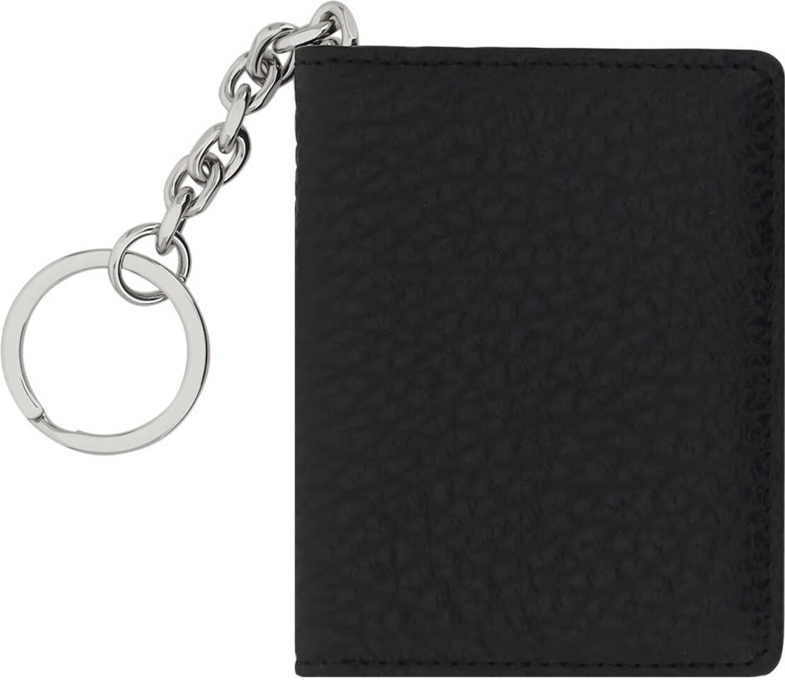 Calfskin Keychain by Margiela, snap-button closure, silver-plated key hook, iconic brand logo printed in contrasting color on inside, keychain features card compartments, monochrome design.