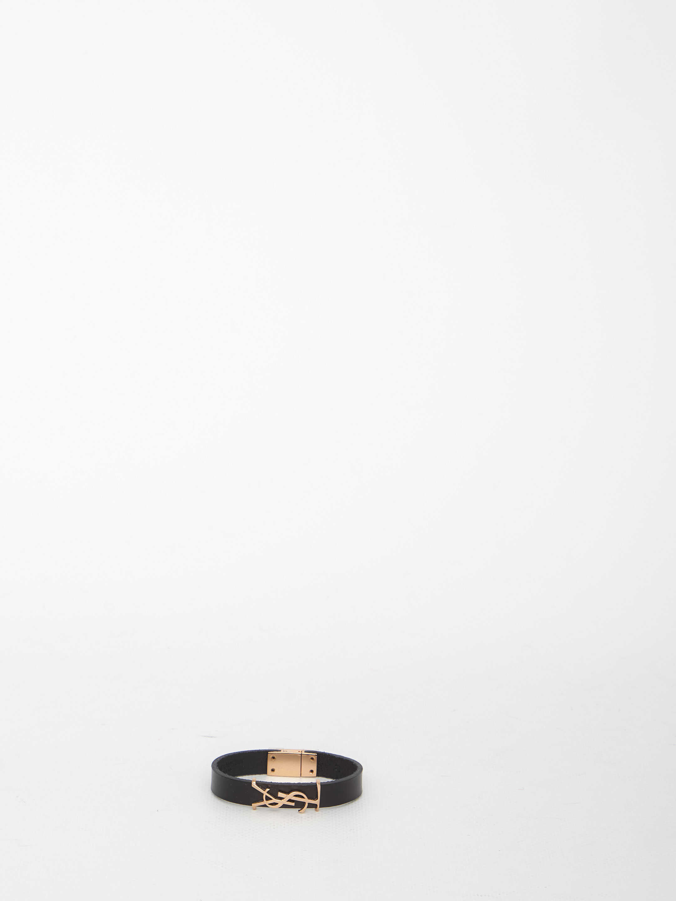Opyum bracelet in black leather with gold-tone metal intertwined YSL initials at center. Clip closure with engraved Saint Laurent Paris logo. Any leather imperfections are not to be considered manufacturing defects, but a peculiarity of the material.