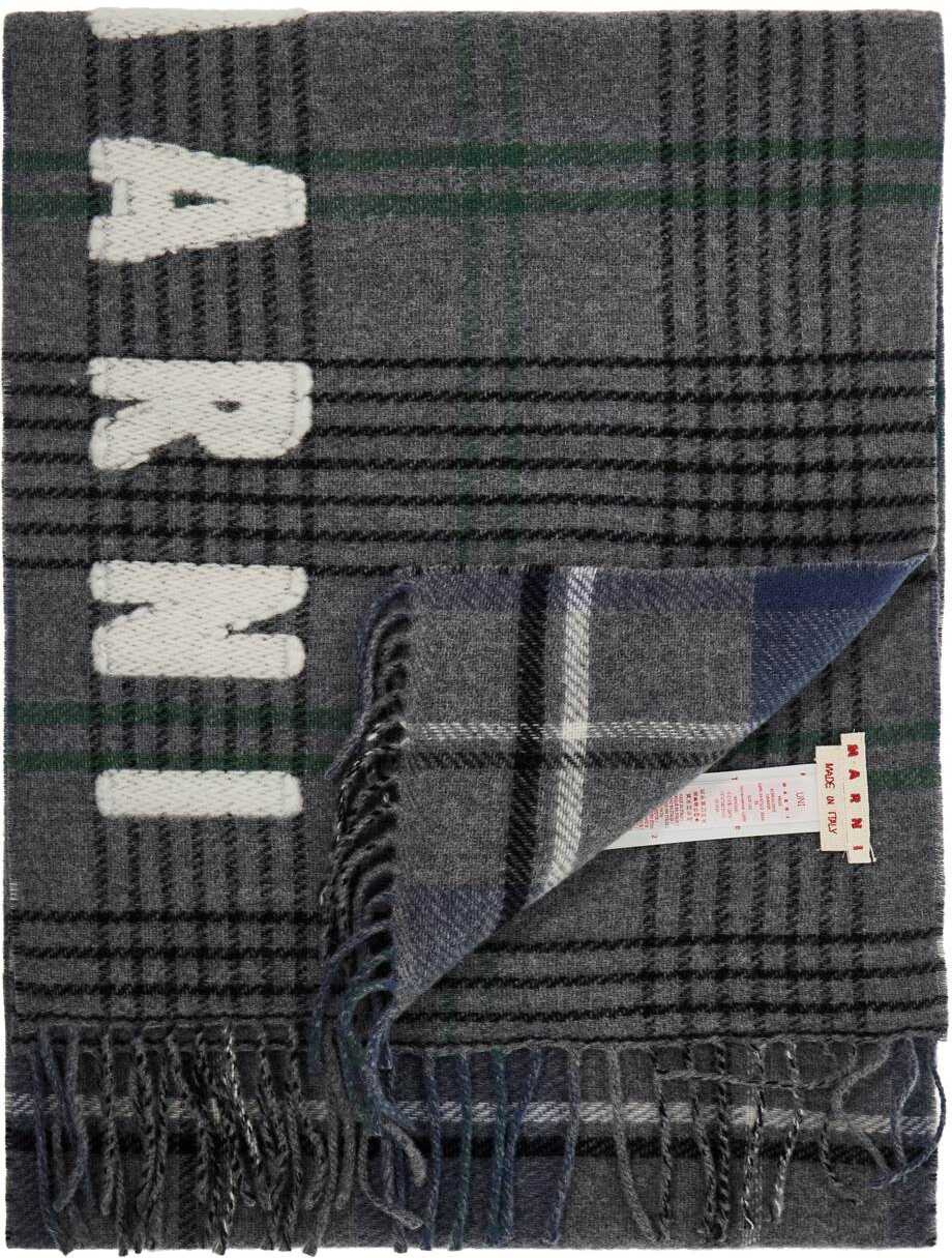 Marni wool scarf with plaid pattern on each side, embellished with contrasting embroidered logo and fringed edges.