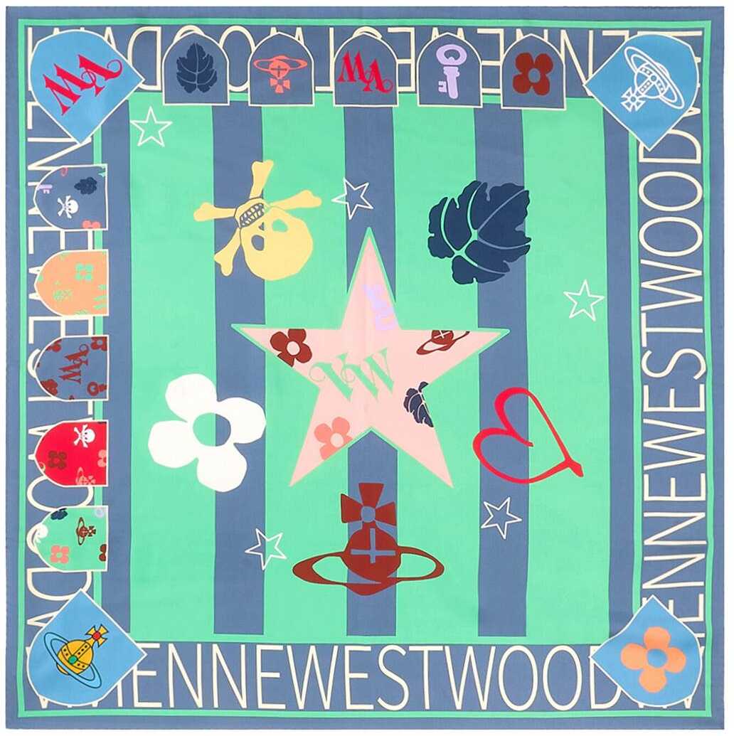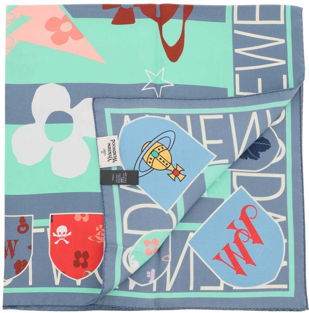 This square foulard by Vivienne Westwood is made of pure silk twill and embellished with a Football motif, emblems, and all-over printed logo lettering.