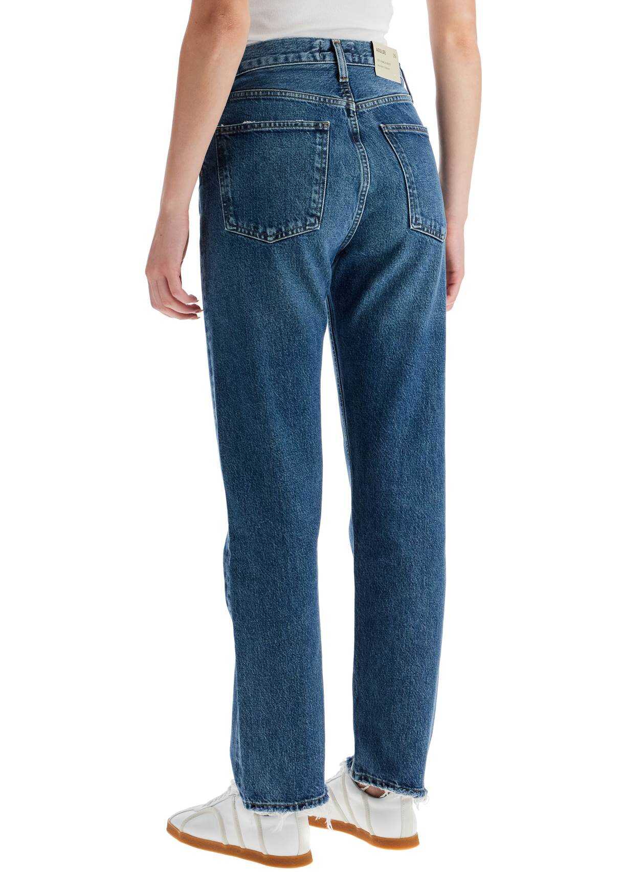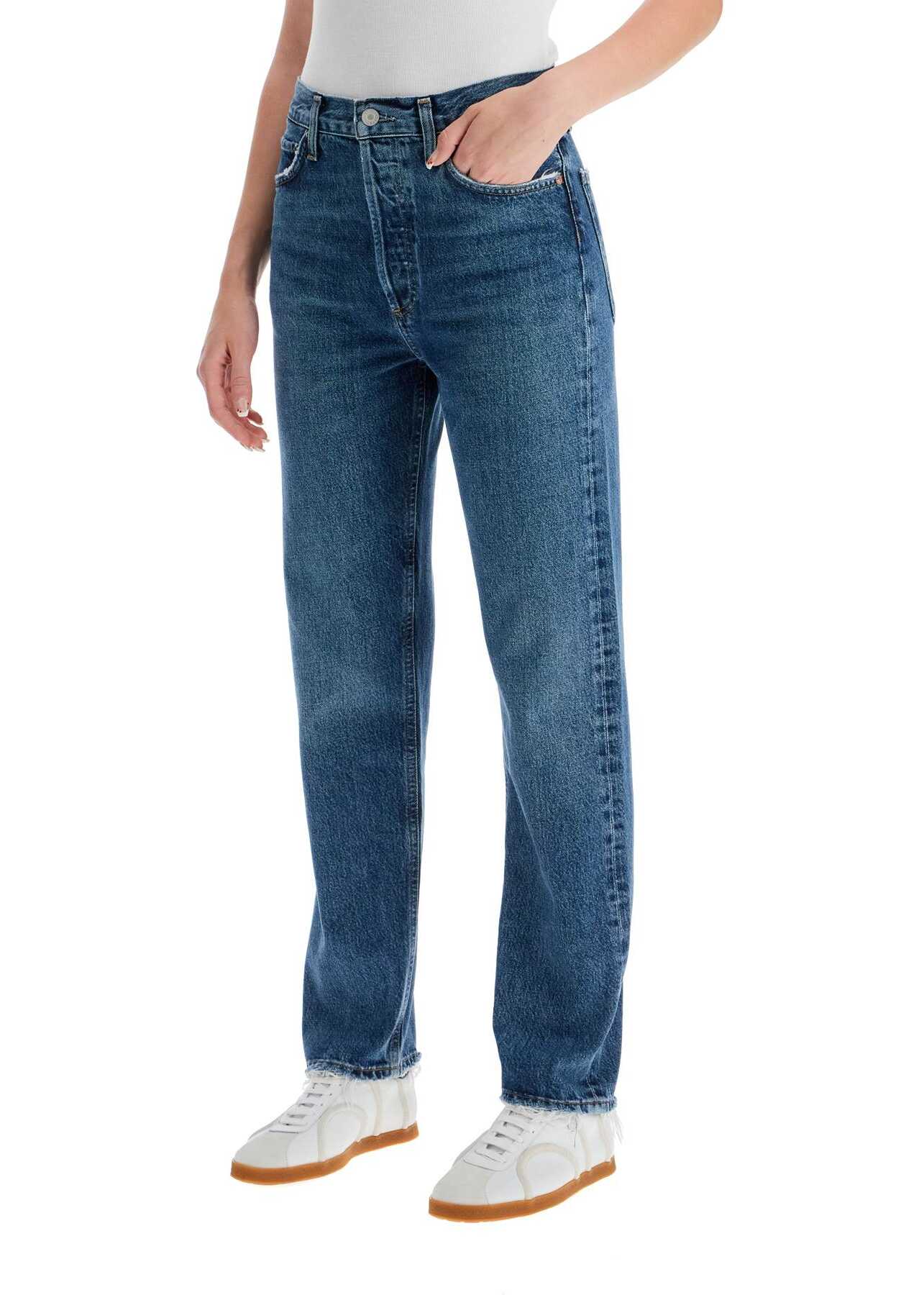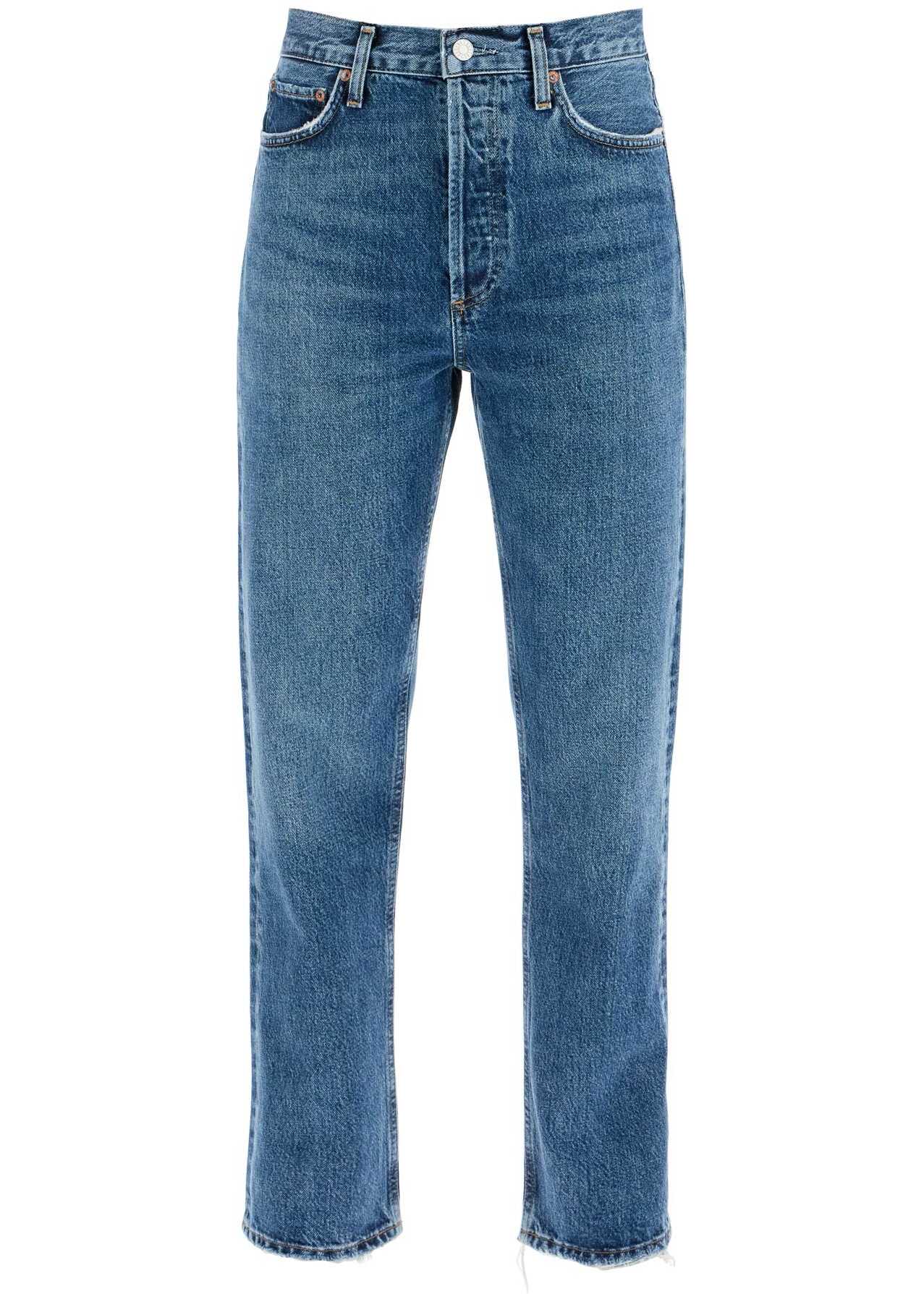 These Agolde high-waisted jeans are made from sustainable cotton and lyocell denim, featuring a classic five-pocket design with distressed hems and a straight leg. They have a hidden button closure. The model is 177 cm tall and wears a size 26.