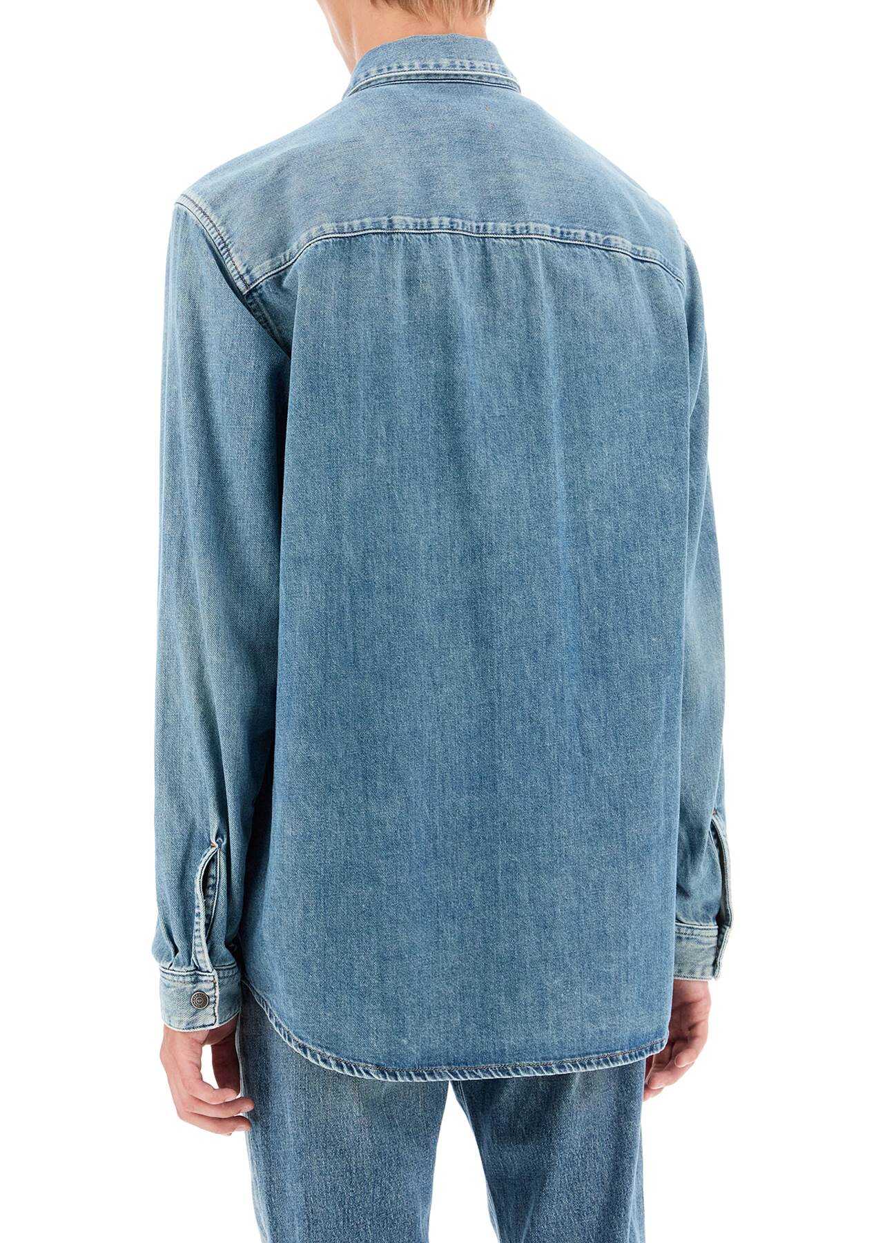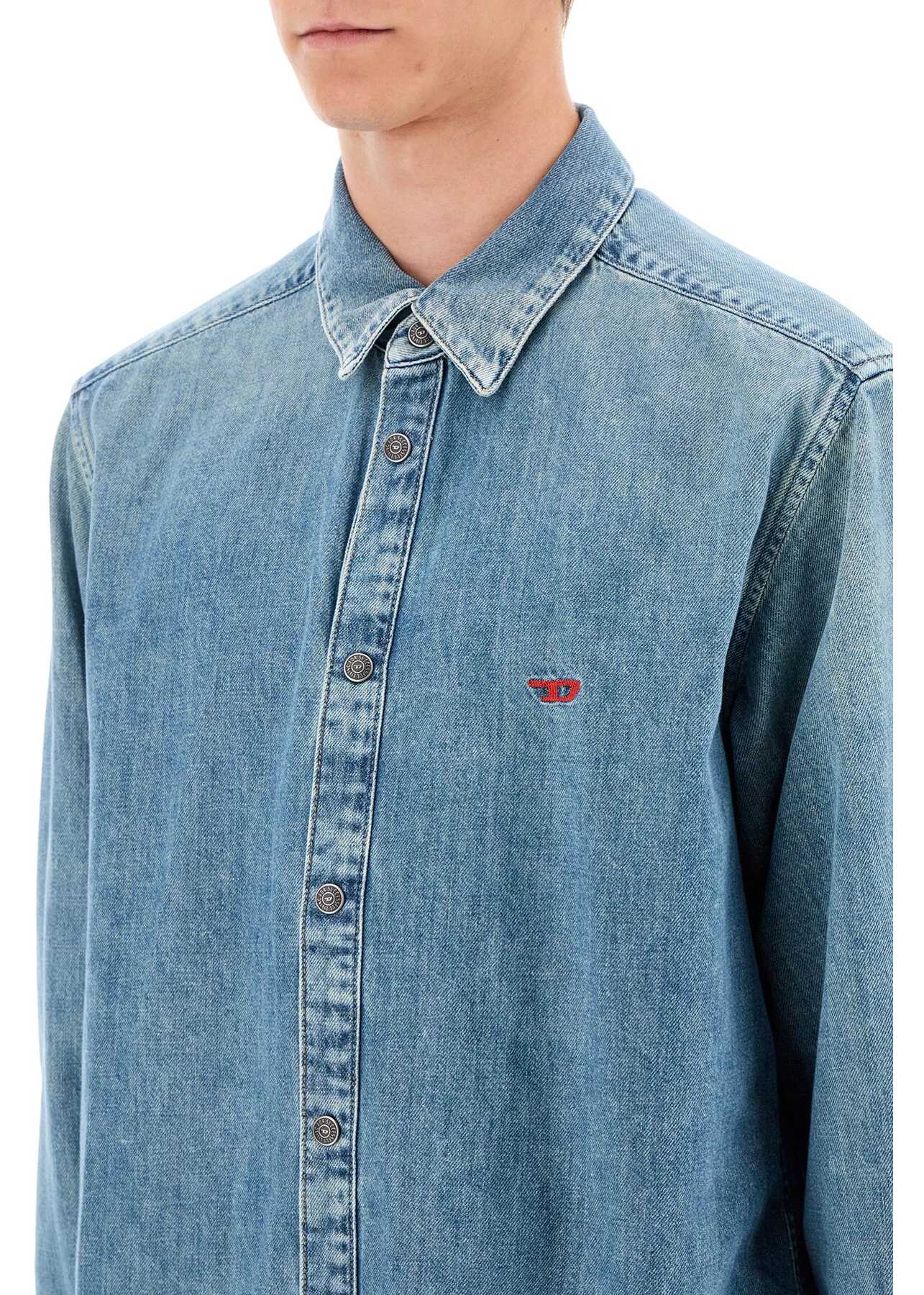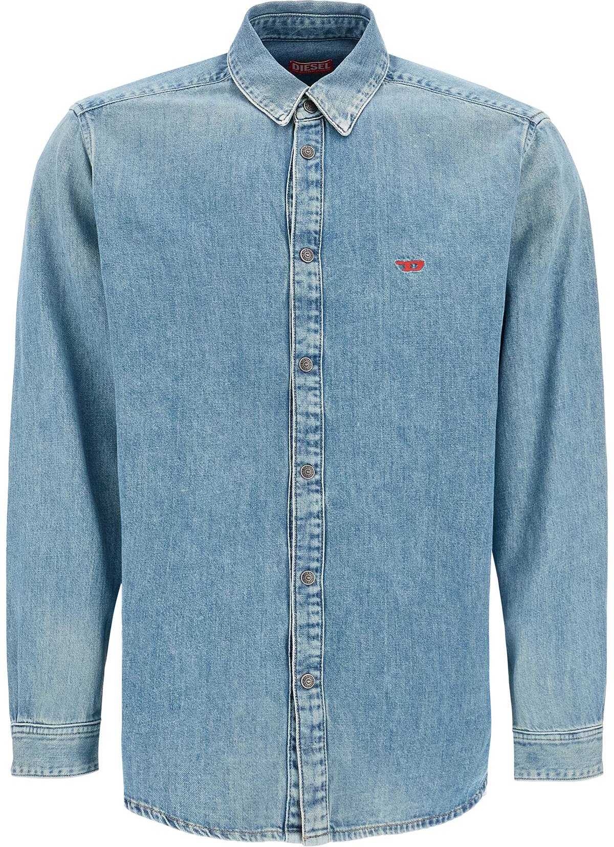 This long-sleeved Diesel shirt is made of pure cotton denim with a light, distressed wash. It features branded button closure, a classic collar, single-button cuffs, and detailed with an embroidered Oval D logo on the chest. The fit is relaxed. The model is 187 cm tall and wears size L.