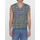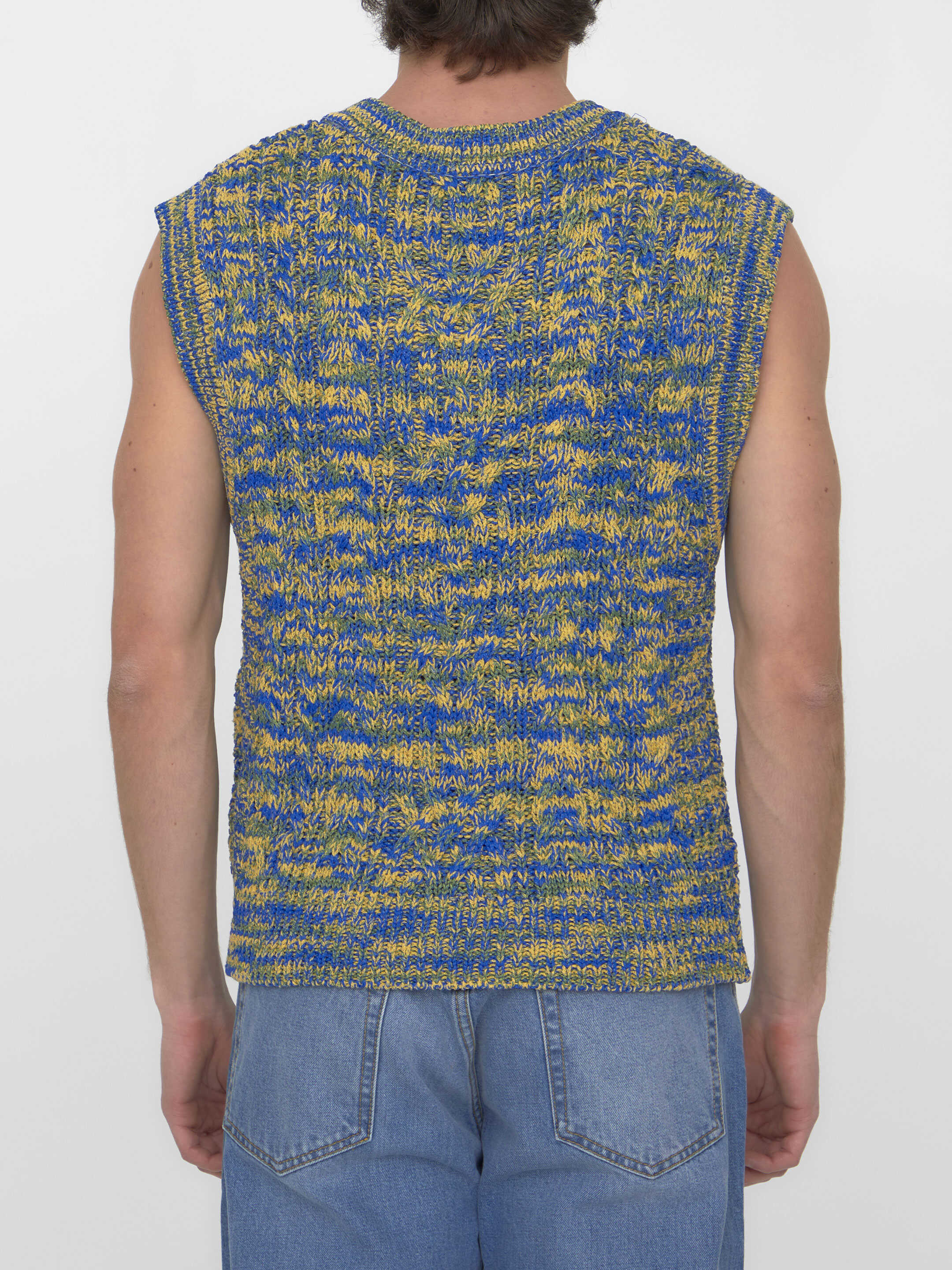Cable-knit vest in the shades of blue and yellow. It features V-neckline and ribbed finishes.