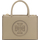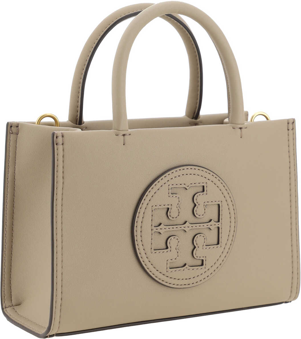 Ella Mini Handbag by Tory Burch, top zipper closure, iconic brand logo engraved on front, tone-on-tone topstitching, matching double stiff top handle, flat pocket inside, matching removable and adjustable flat shoulder strap, faux leather design.