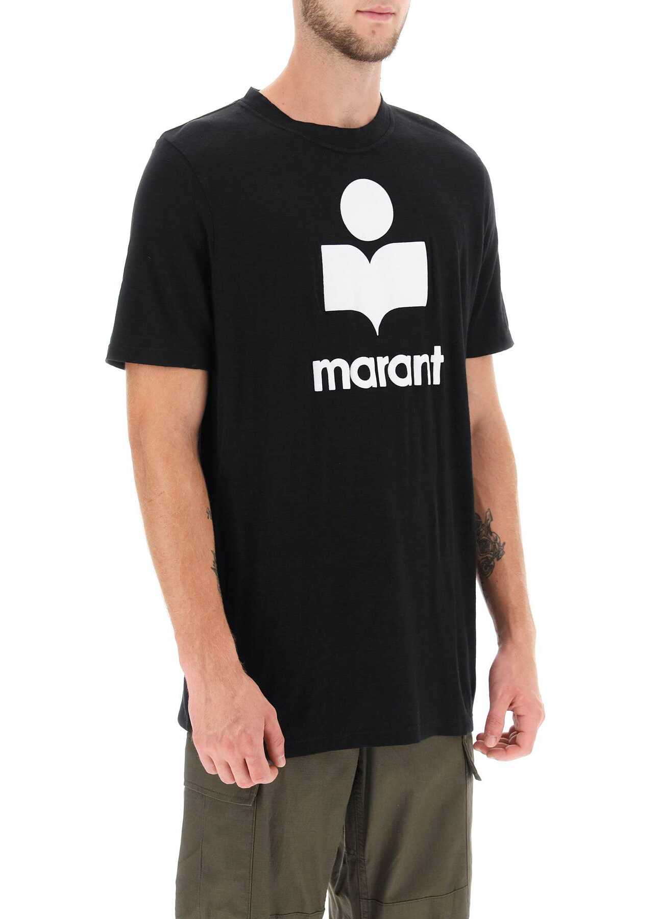 Marant short-sleeved crewneck T-shirt made of lightweight slub linen jersey with contrast flocked logo print at the front. The model is 187 tall and wears a size L.
