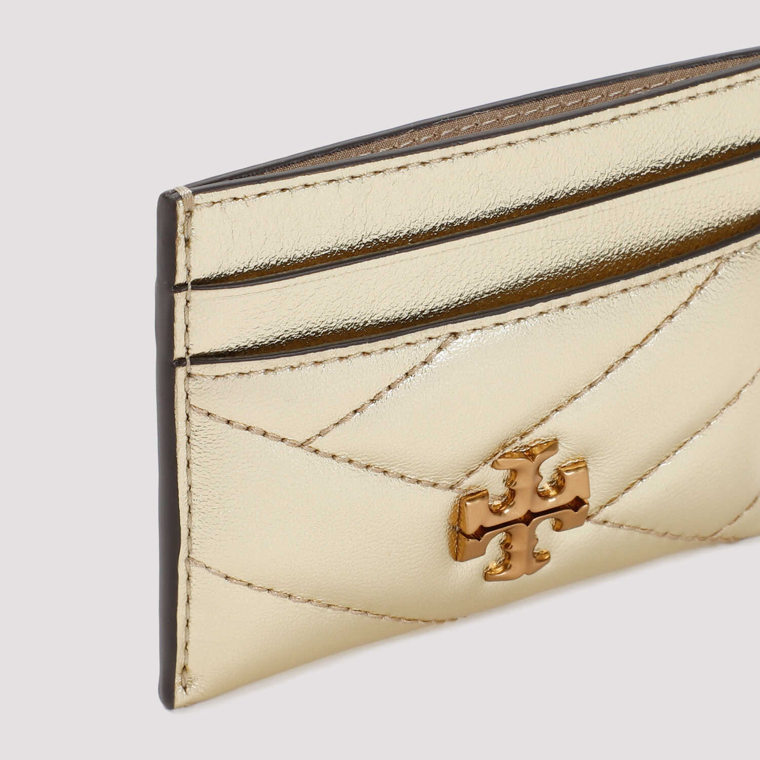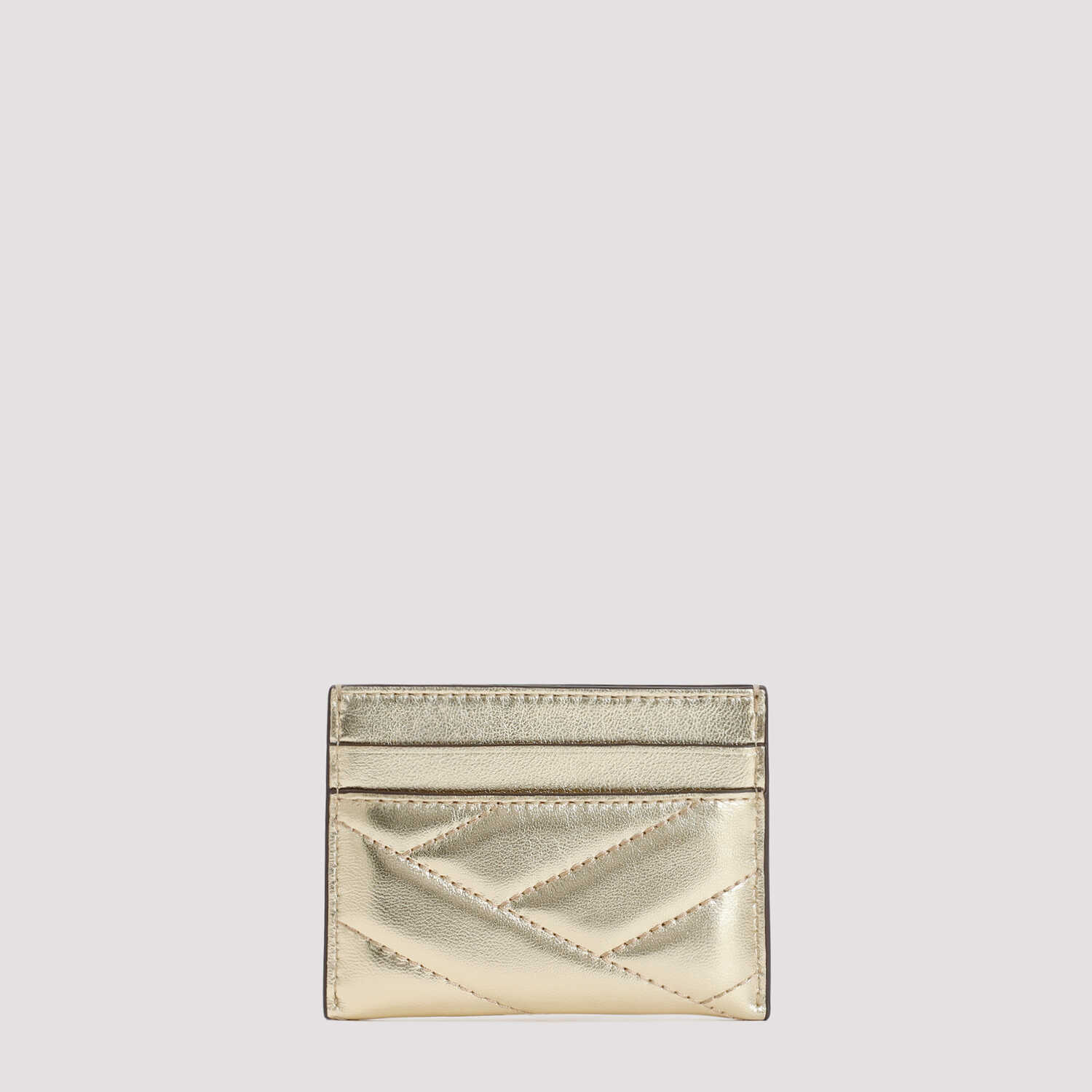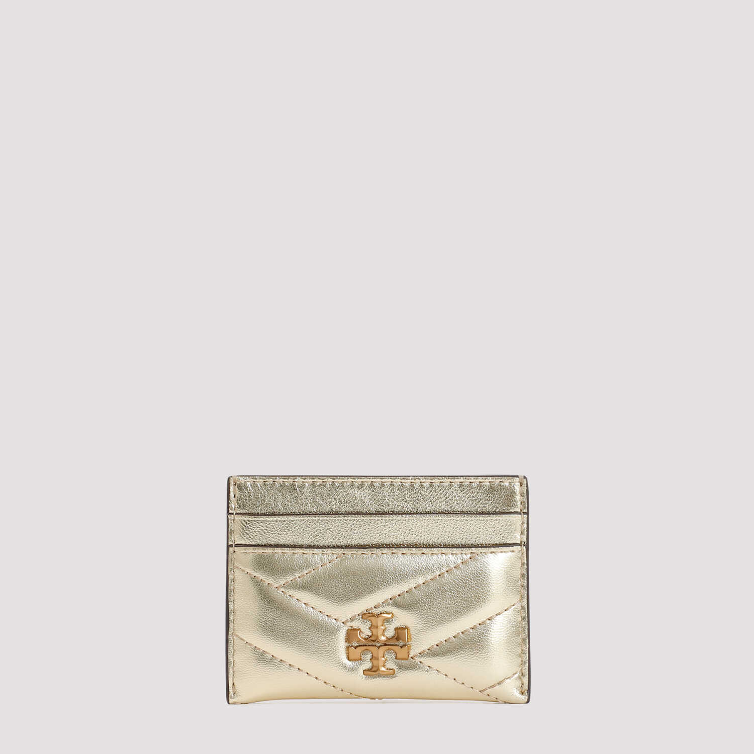 Tory Burch Gold Nappa Lamb Leather Kira Chevron Card Case. Pure gold nappa lamb leather card case, front gold-tone metallic logo, front and back quilted effect, two front card slots, two back card slots, one card slot on the top.