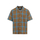Universal Works Camp Light Blue Camp Cotton Shirt. Crafted from checkered light blue and sand cotton, pointed collar, front button closure, patch pocket on the breast, short sleeves, two pleats on the back, straight hem.