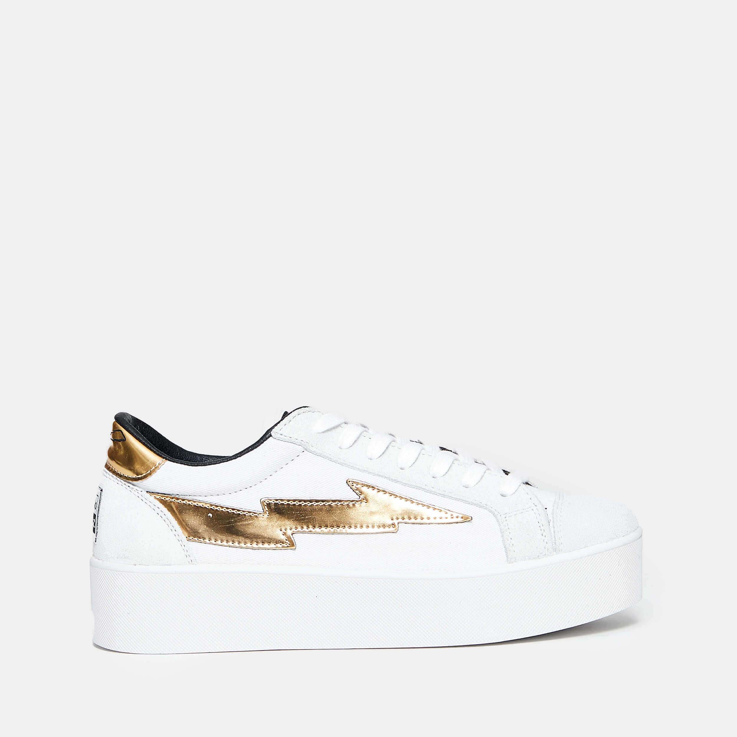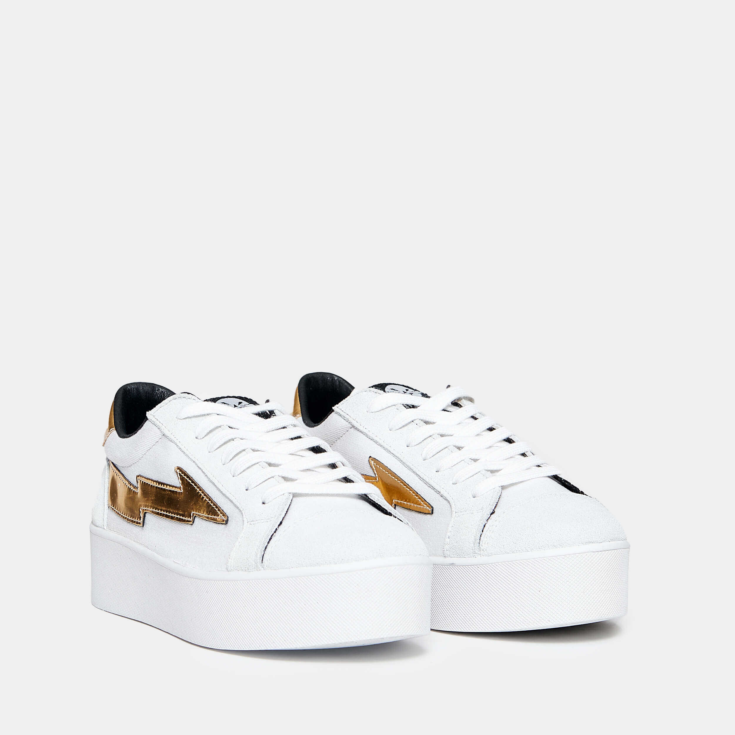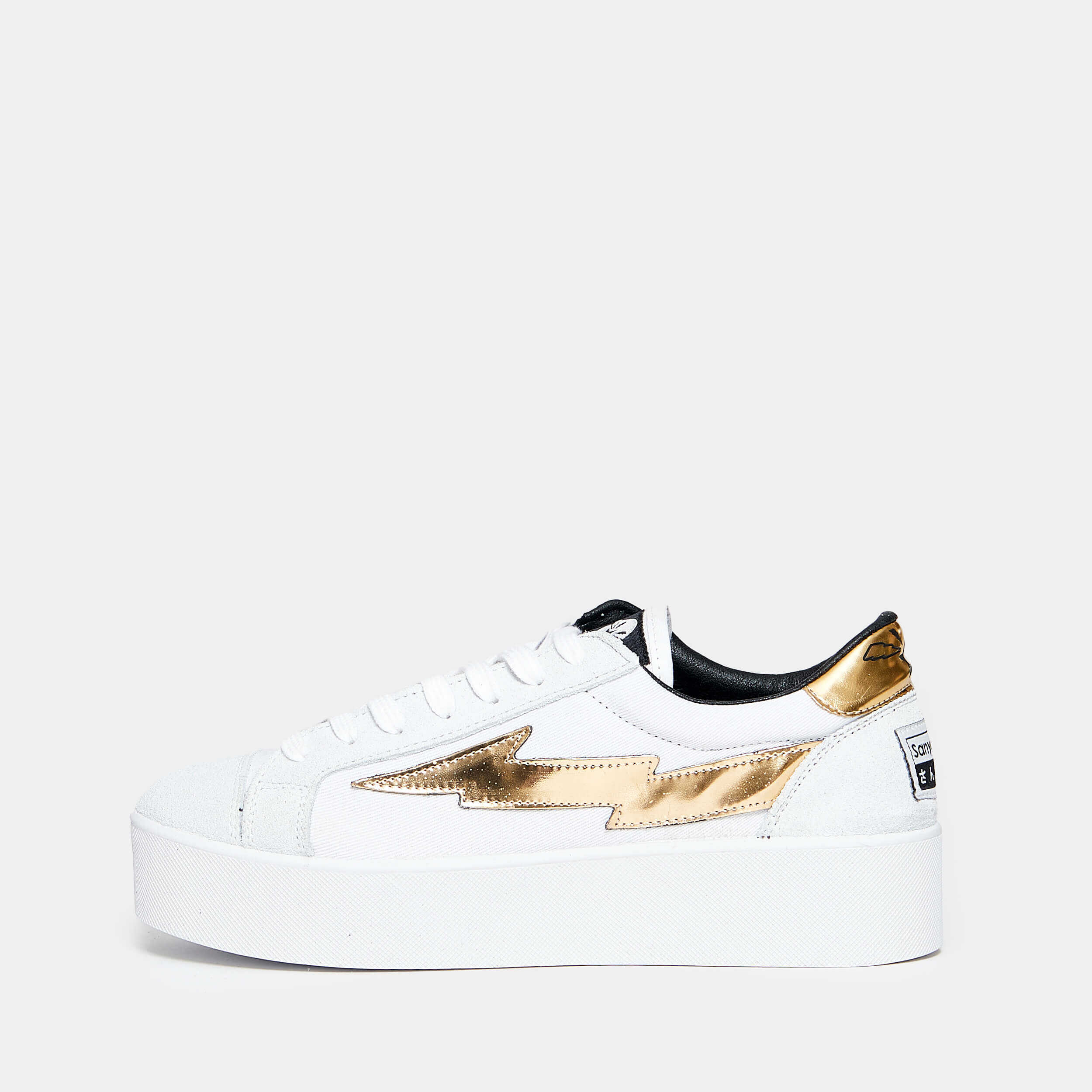 Step up your sneaker game with the SANYAKO cotton sneaker in white. Featuring a cassette bottom with a 3cm lift and a lightning bolt logo in gold naplak, these sneakers are perfect for any casual occasion. The comfortable fit ensures all-day wearability, making them a must-have addition to your shoe collection. Get yours today!