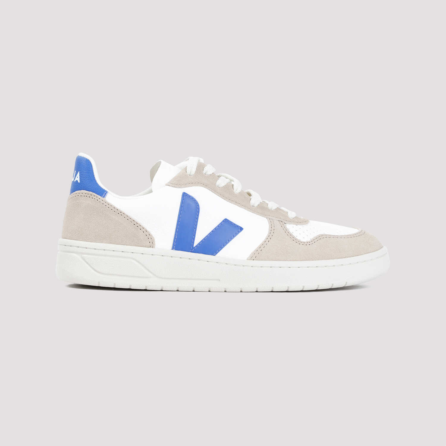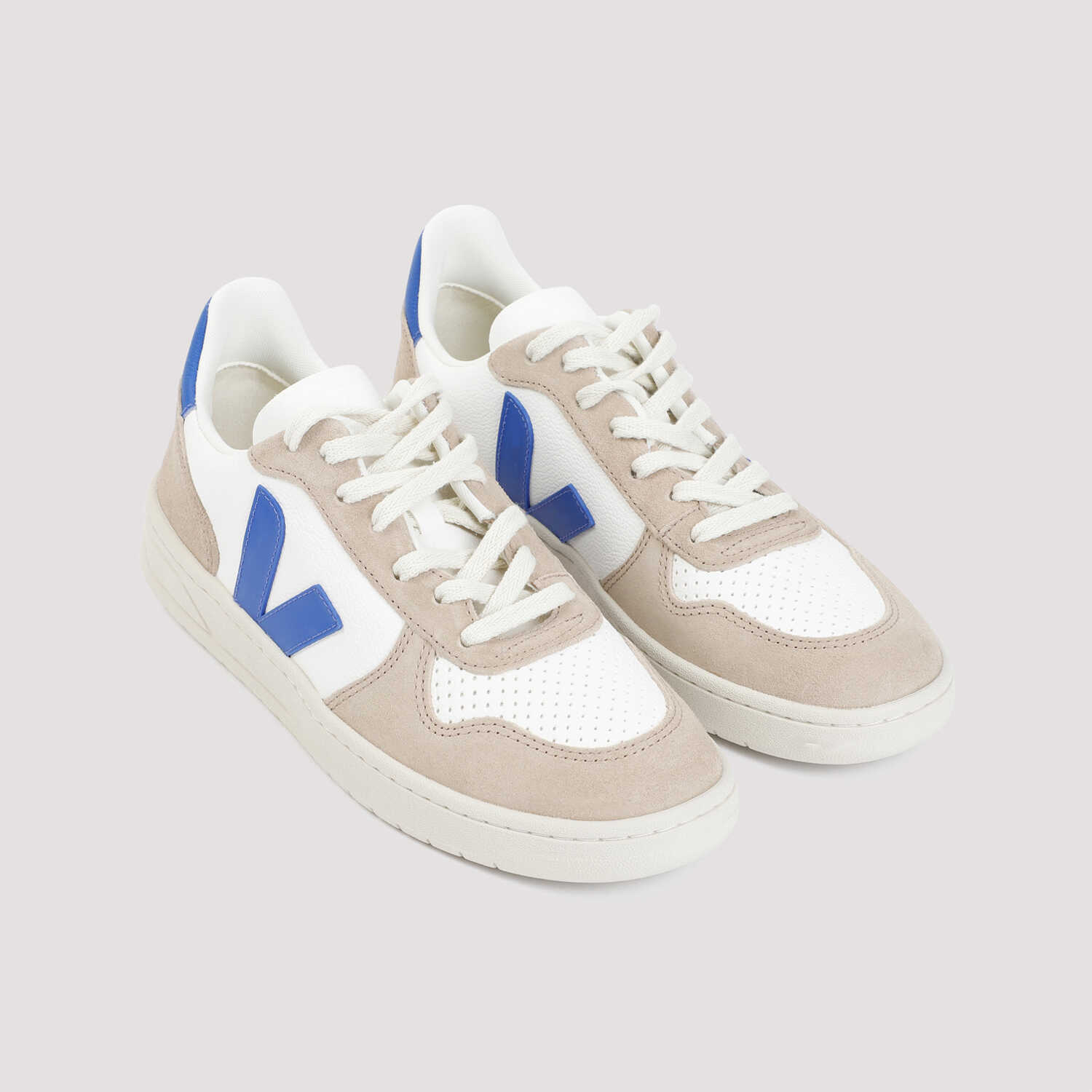 Veja White and Blue Leather V10 Sneakers. White and Blue leather and suede upper, round toeline, lace-up fastening, V logo on side and logo on heel tab. Rubber sole, regular fit.