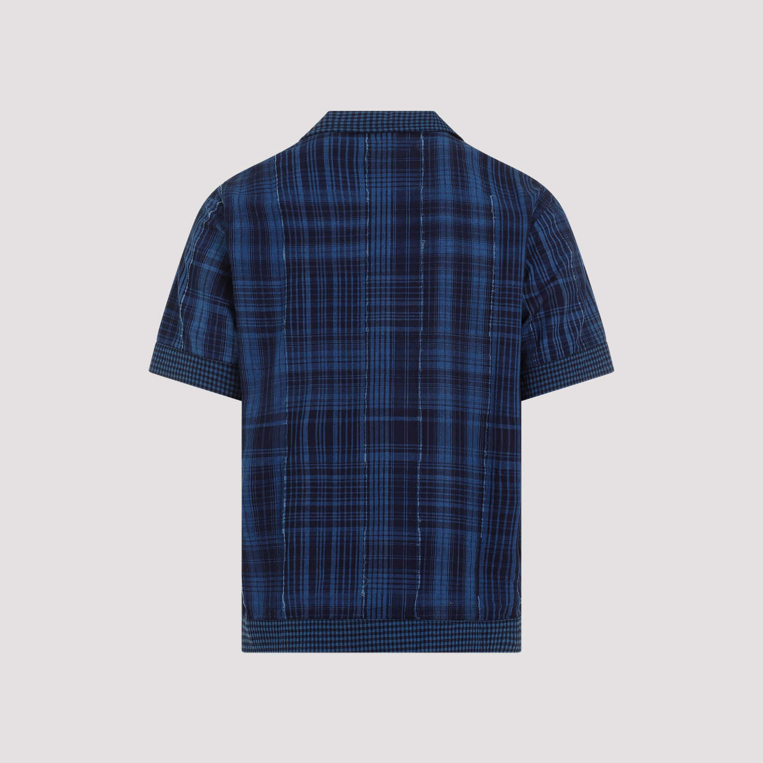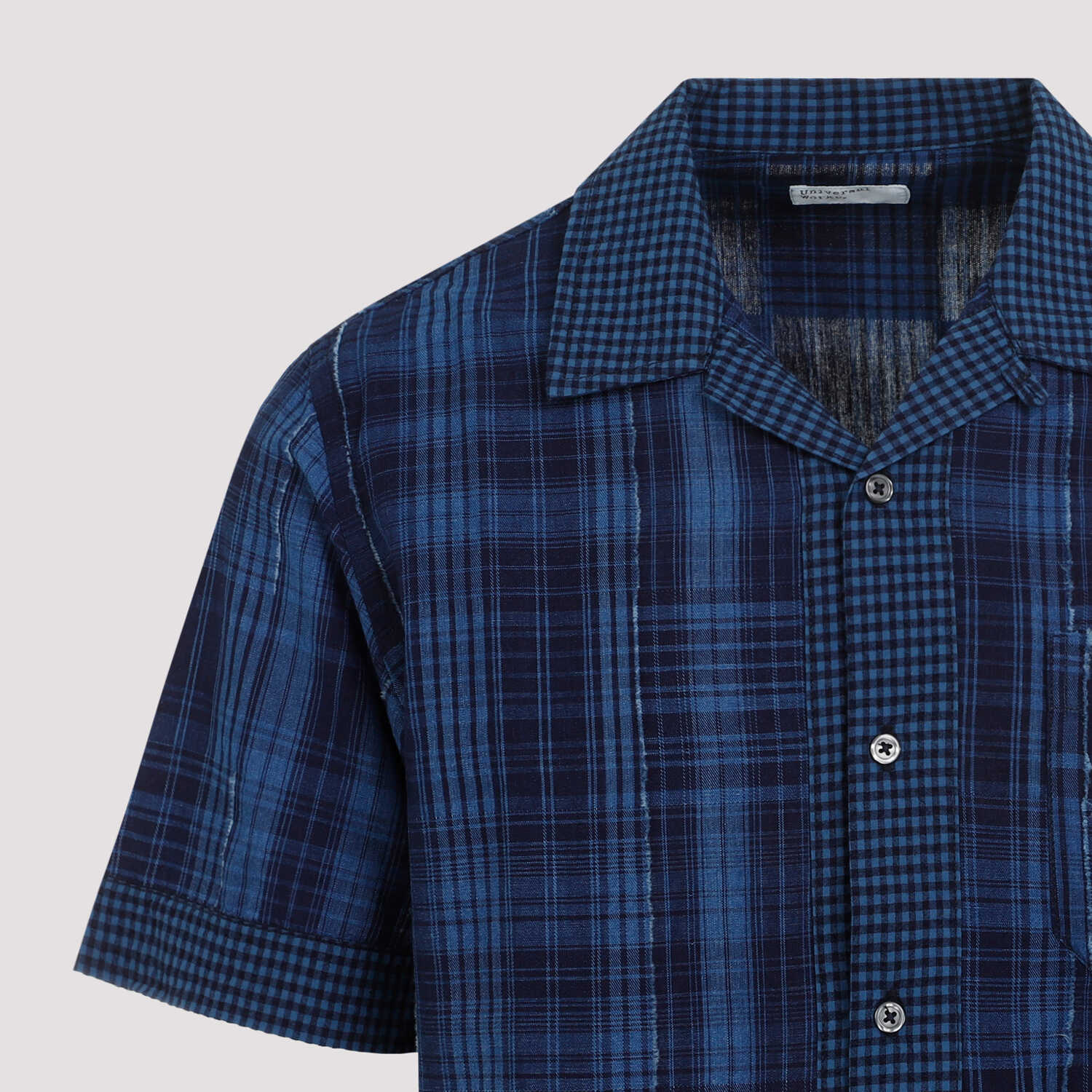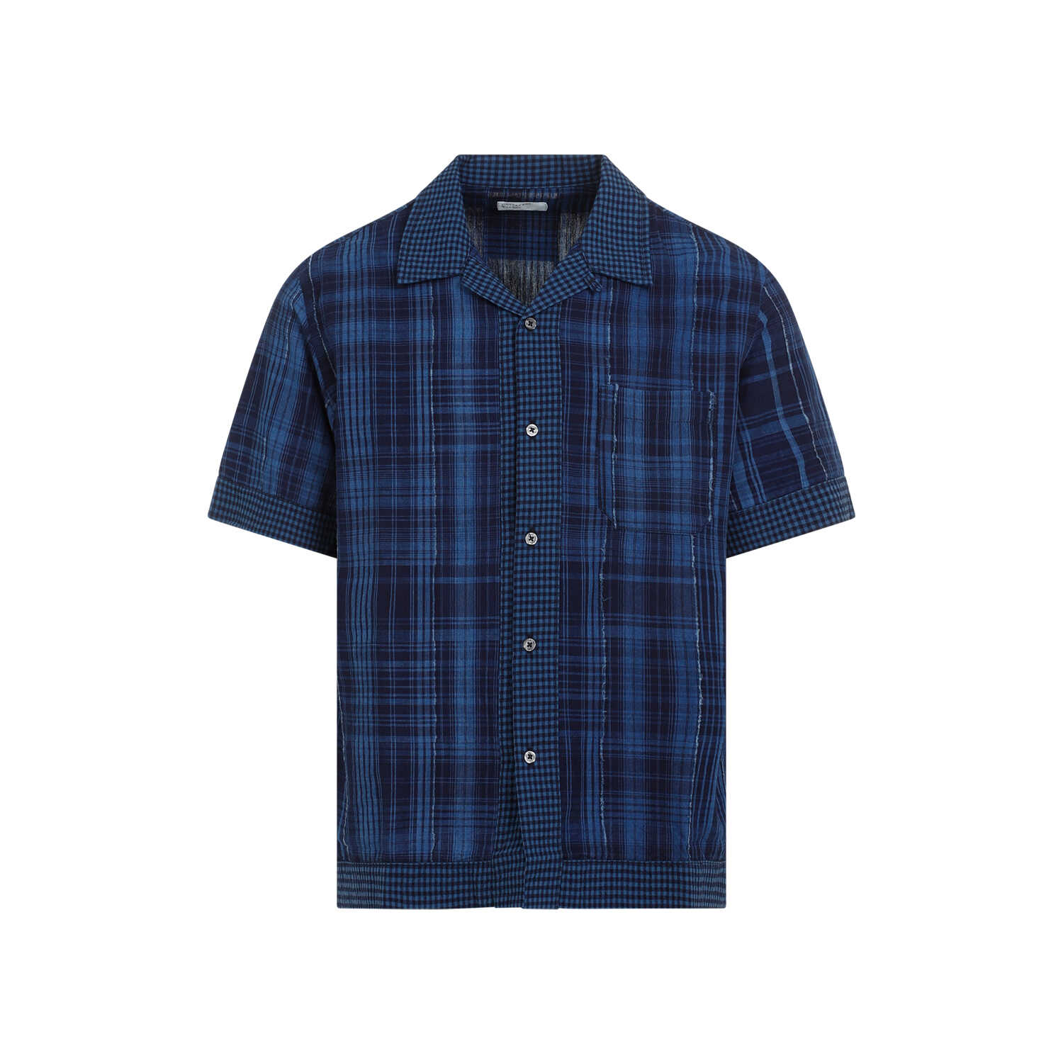 Universal Works Border Road Indigo Cotton Shirt. Checkered indigo cotton, Bowling collar, front button closure, breast patch pocket, short sleeves, straight hem.