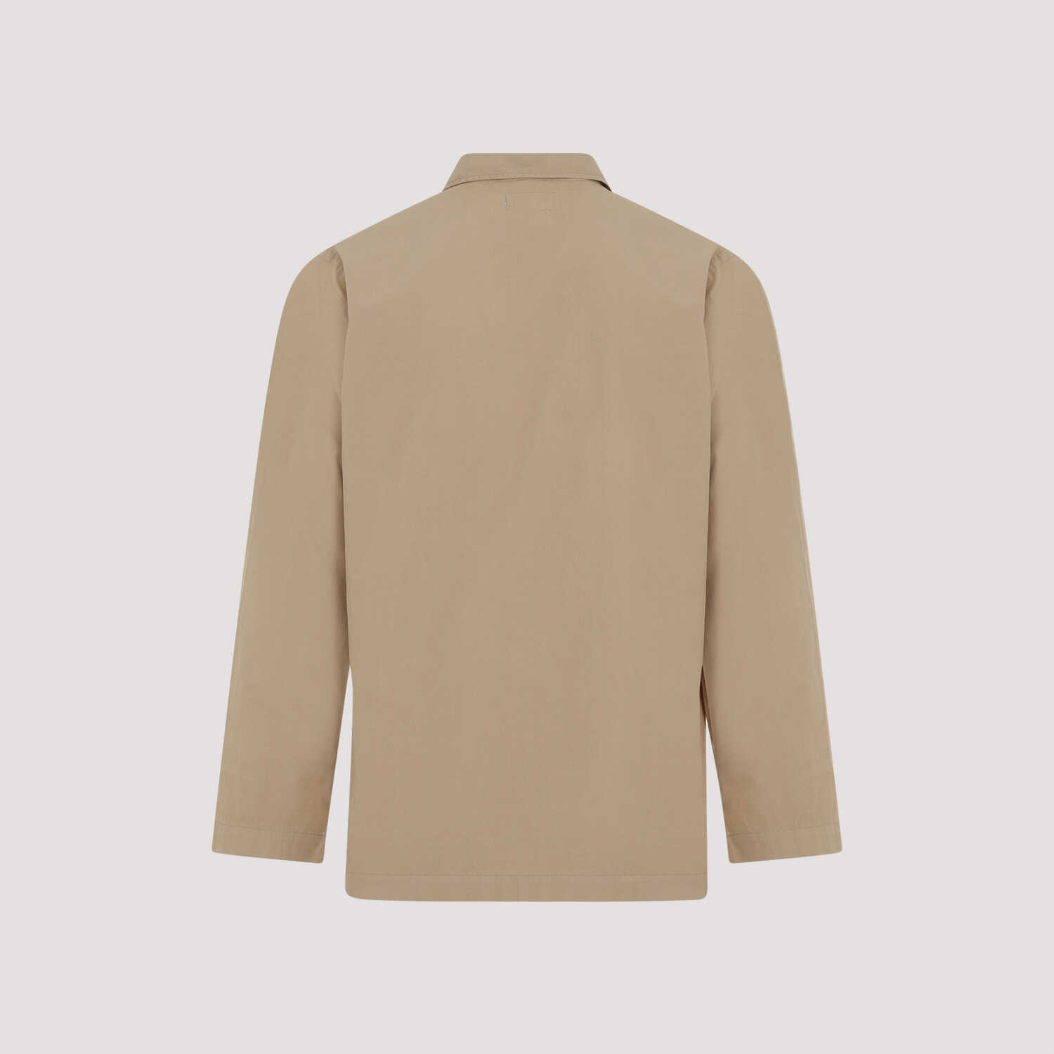 Universal Works Bakers Beige Organic Cotton Overshirt. Beige organic cotton, pointed collar, button fastening on the front, breast pocket and two patch pocket on the front, long sleeves, straight hem, unlined.