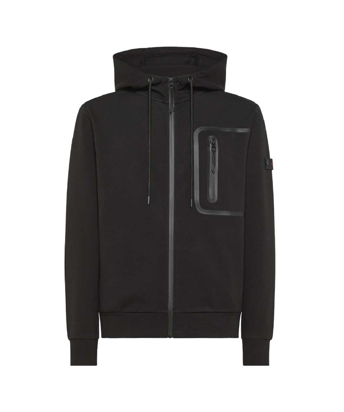 Soft and comfortable sweatshirt with central zip and large adjustable hood, in polyester and stretch cotton. The model is characterized by a chest pocket, edged with rubberized taping and a zip closure. A garment with a bold character and sporting inspiration. Personalization with Peuterey logo on the left sleeve stamped with buttons. Hood with tie rods Front pocket with zip Made of stretch polyester and cotton