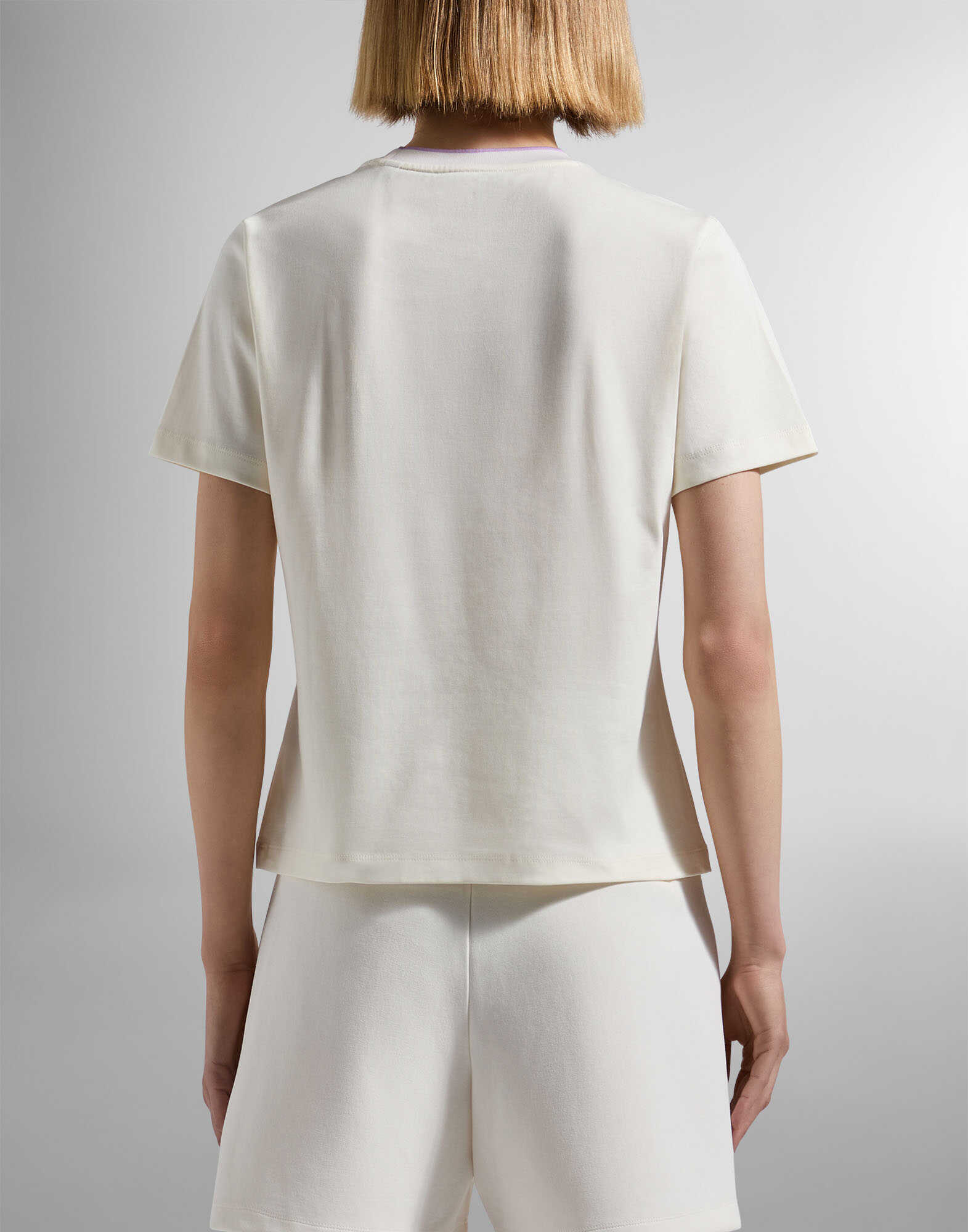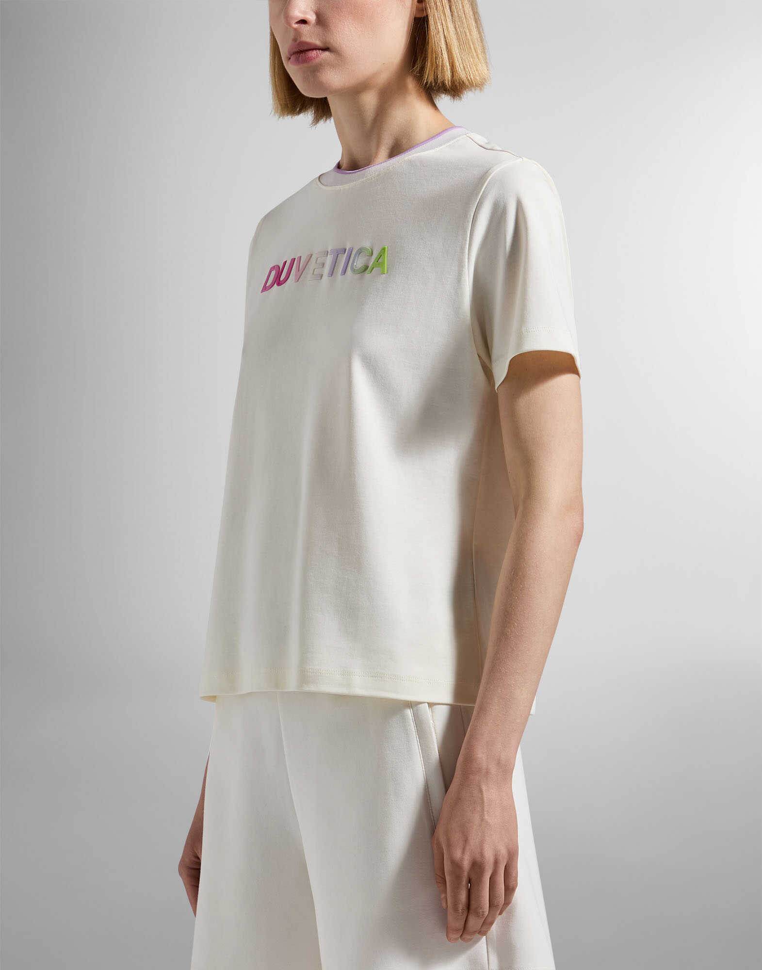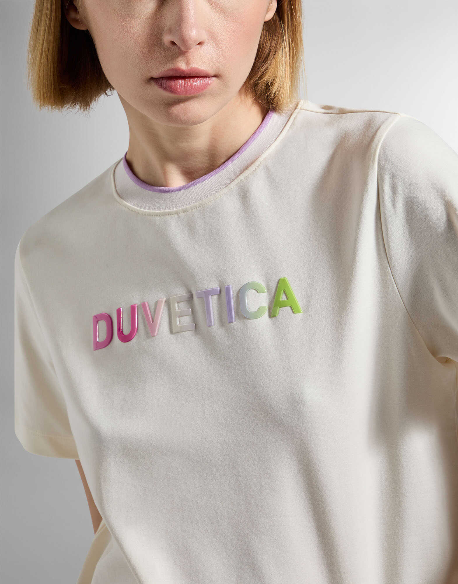 Add a pop of color to your wardrobe with CURON, the women's crew neck t-shirt by Duvetica. Featuring a colorful logo at the front and ribbed trim, this ivory t-shirt is perfect for a day out in nature or spending time with loved ones. Made with 100% cotton, the REGULAR fit ensures a comfortable and stylish look. Shop now and elevate your style with DUVETICA.