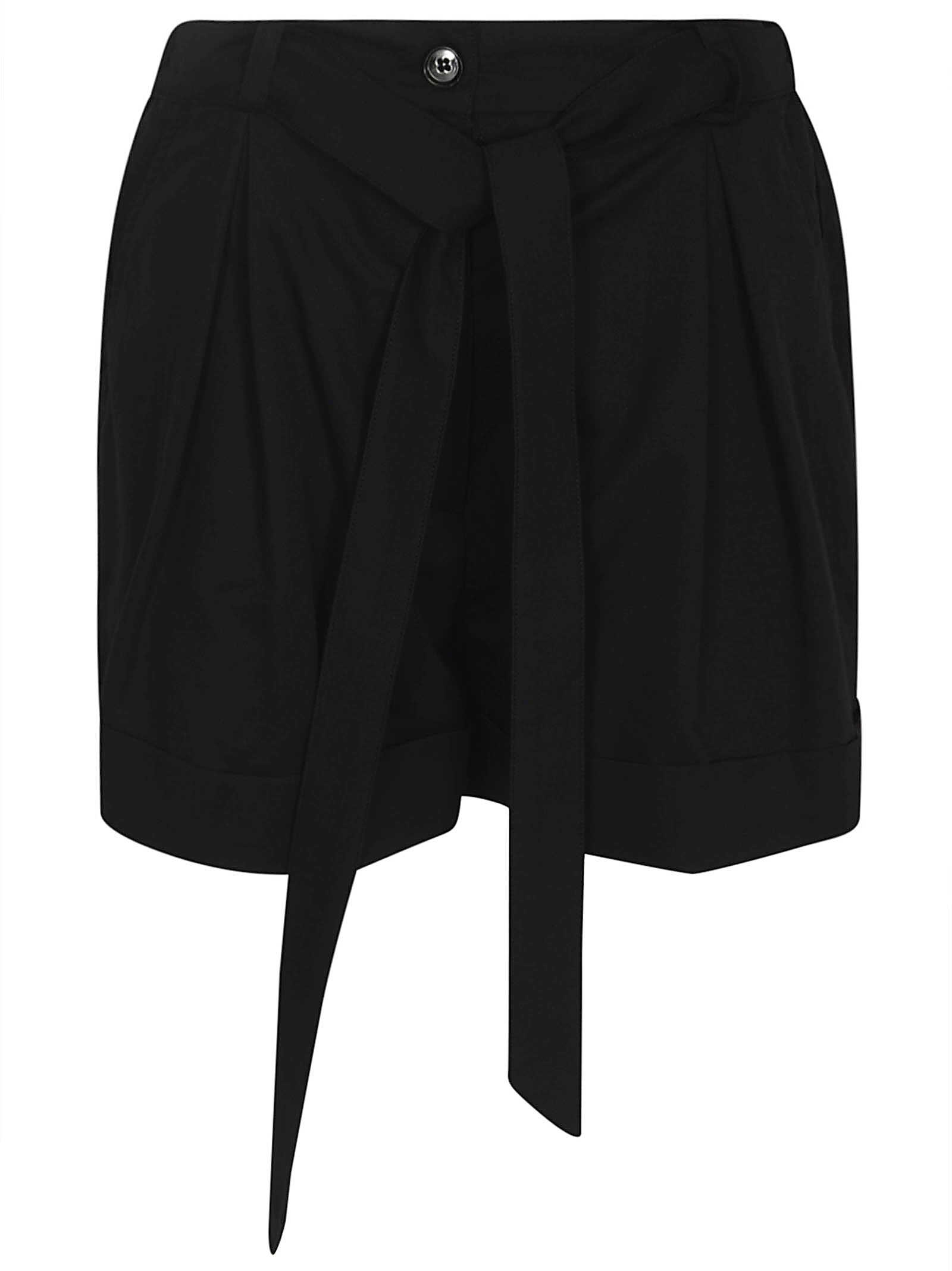 black cotton poplin texture pleat detailing concealed fly and button fastening rear elasticated waistband belt loops tied waist two diagonal pockets to the sides two rear welt pockets turn-up hem thigh-length