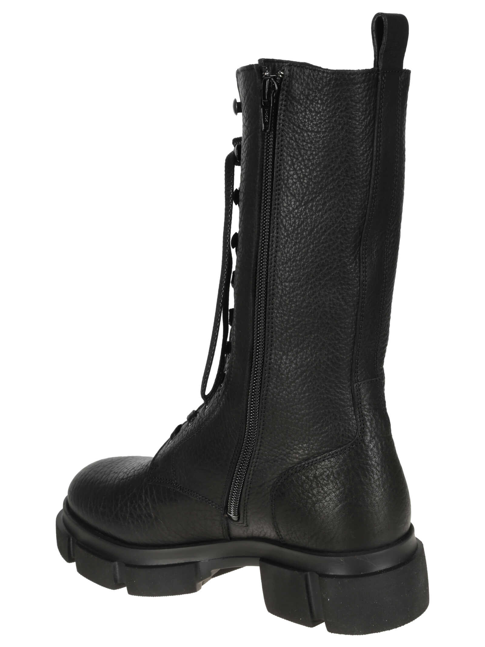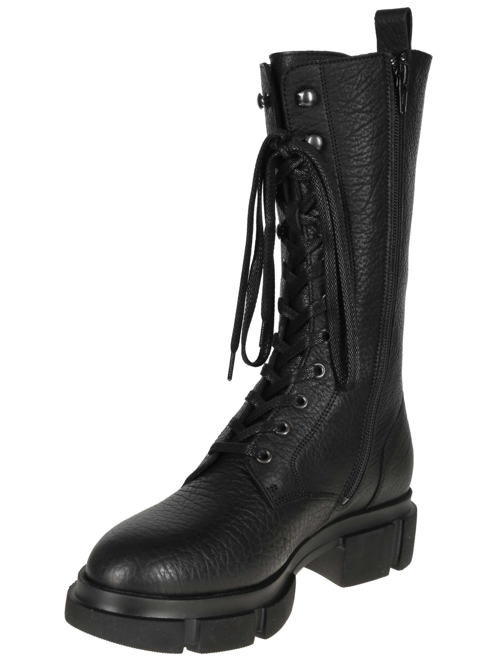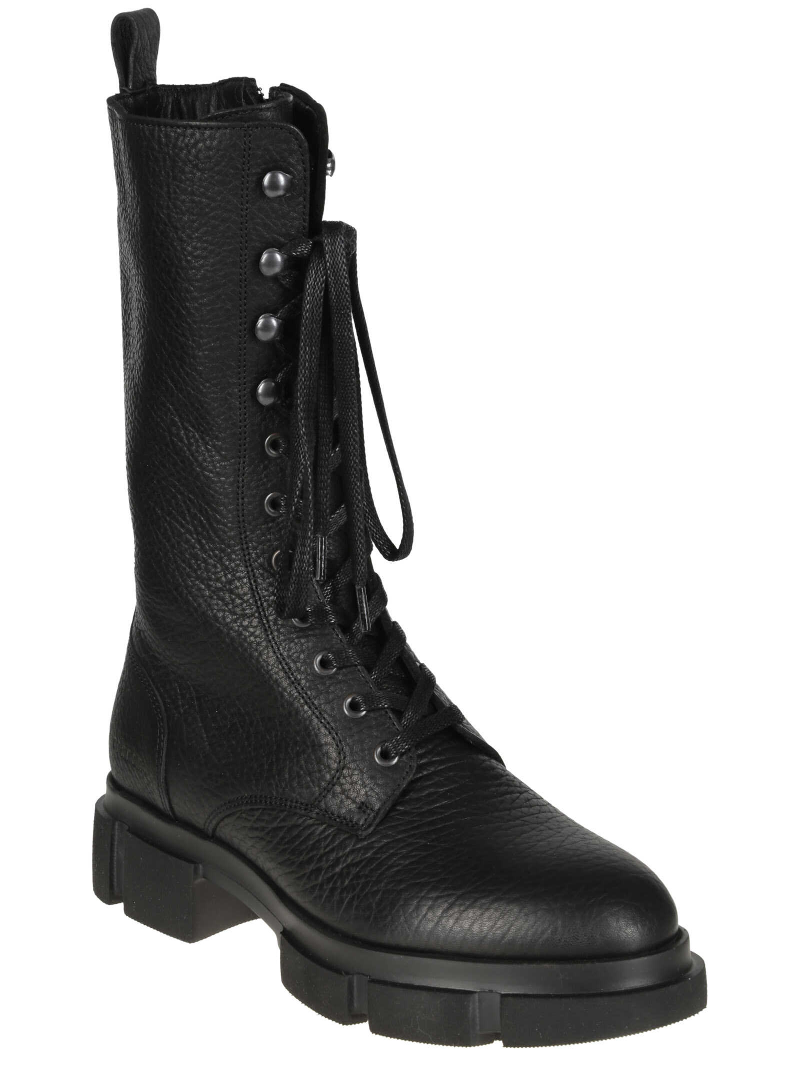 COPENHAGEN BOOT - In black. High lace-up boots made of hammered leather. Silhouette inspired by combat boots. Contrasting elements with embroidered details. Logo on the outside. Front lacing. Zipper on the inside. Pull loop on the back. Round toe. Sturdy rubber sole with wide heel and thick profile. Expressive combat boots with structured details.
