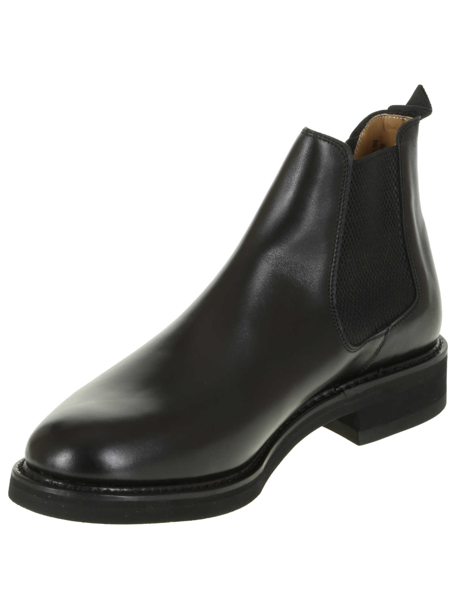 Black leather ankle boot, pull tab on the back, elastic side band, leather insole, rubber sole.