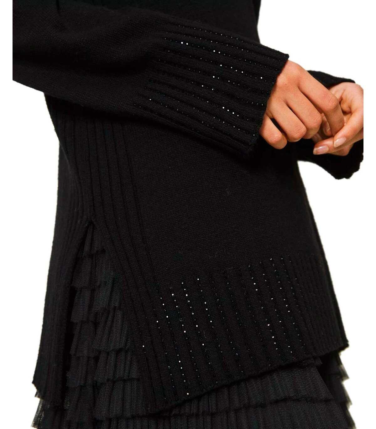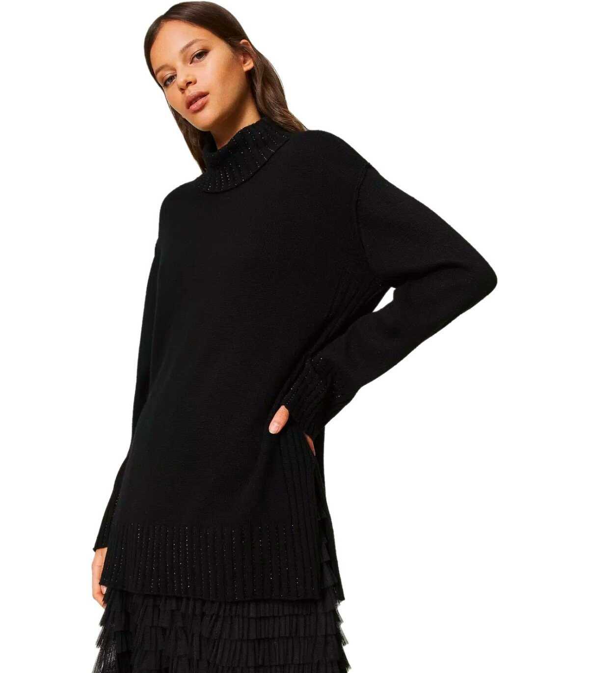 Twinset sweater made in black wool blend, with ribbed profiles embellished with tone-on-tone rhinestones. Slits on the sides and metal logo detail on the back.