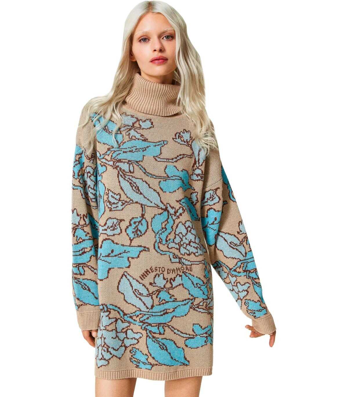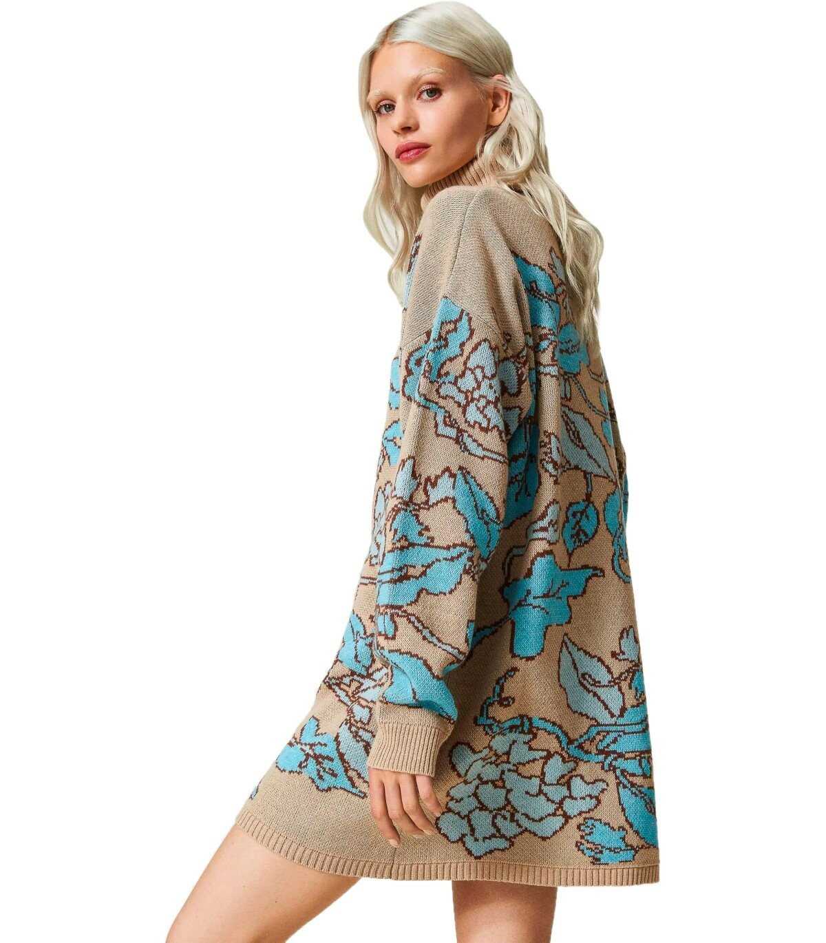 Twinset oversized high-neck jumper is made of a beige wool and cashmere blend, decorated with a leaf jacquard pattern in shades of blue. Ribbed collar, cuffs, and hem. Relaxed fit.