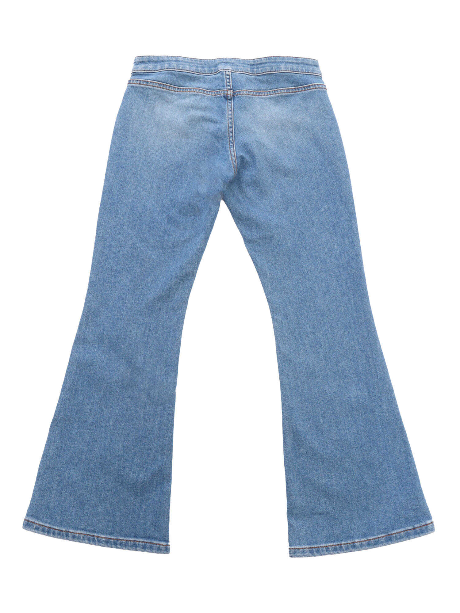 Flared jeans in stretch denim with front pockets, front gold logo detail, visible stitching.