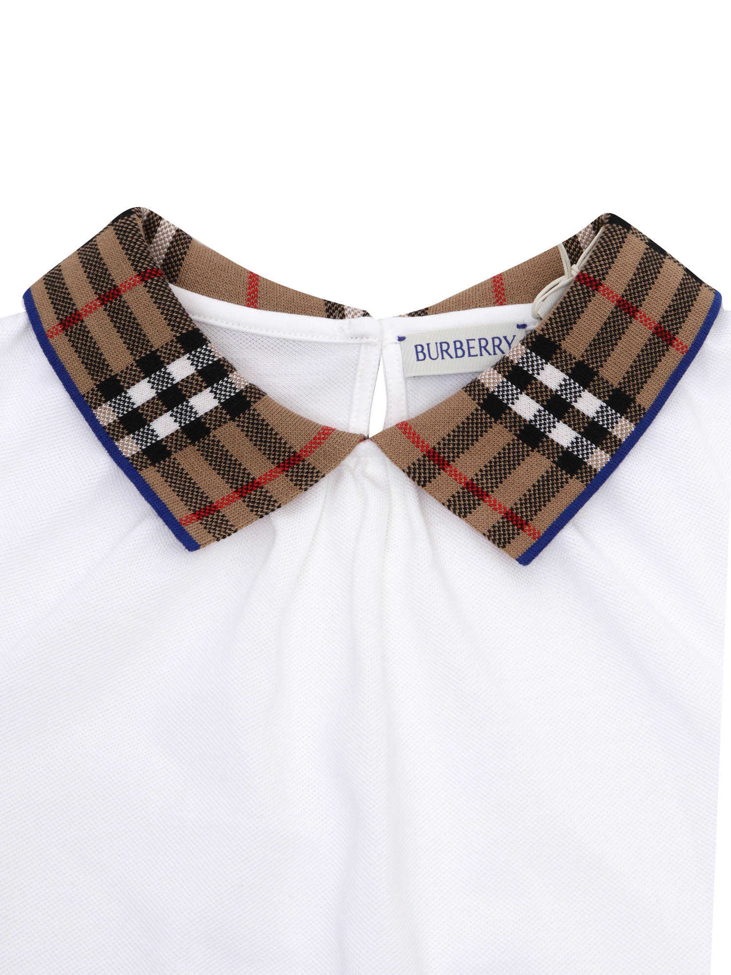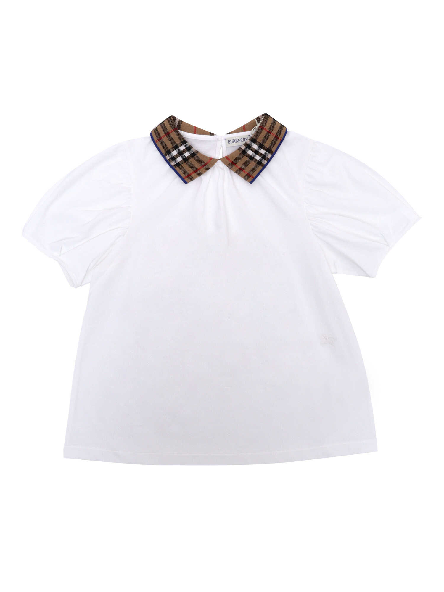 Burberry cotton polo t-shirt for girls, short balloon sleeves, button closure on the front, contrasting lapel collar with tartan pattern.