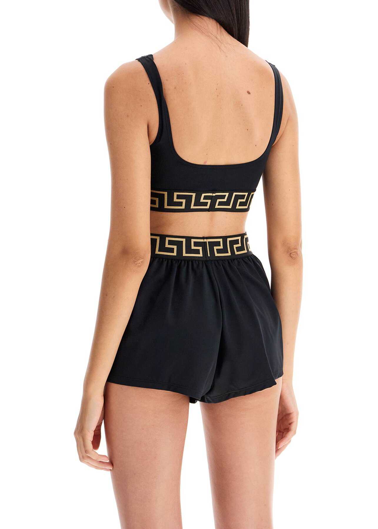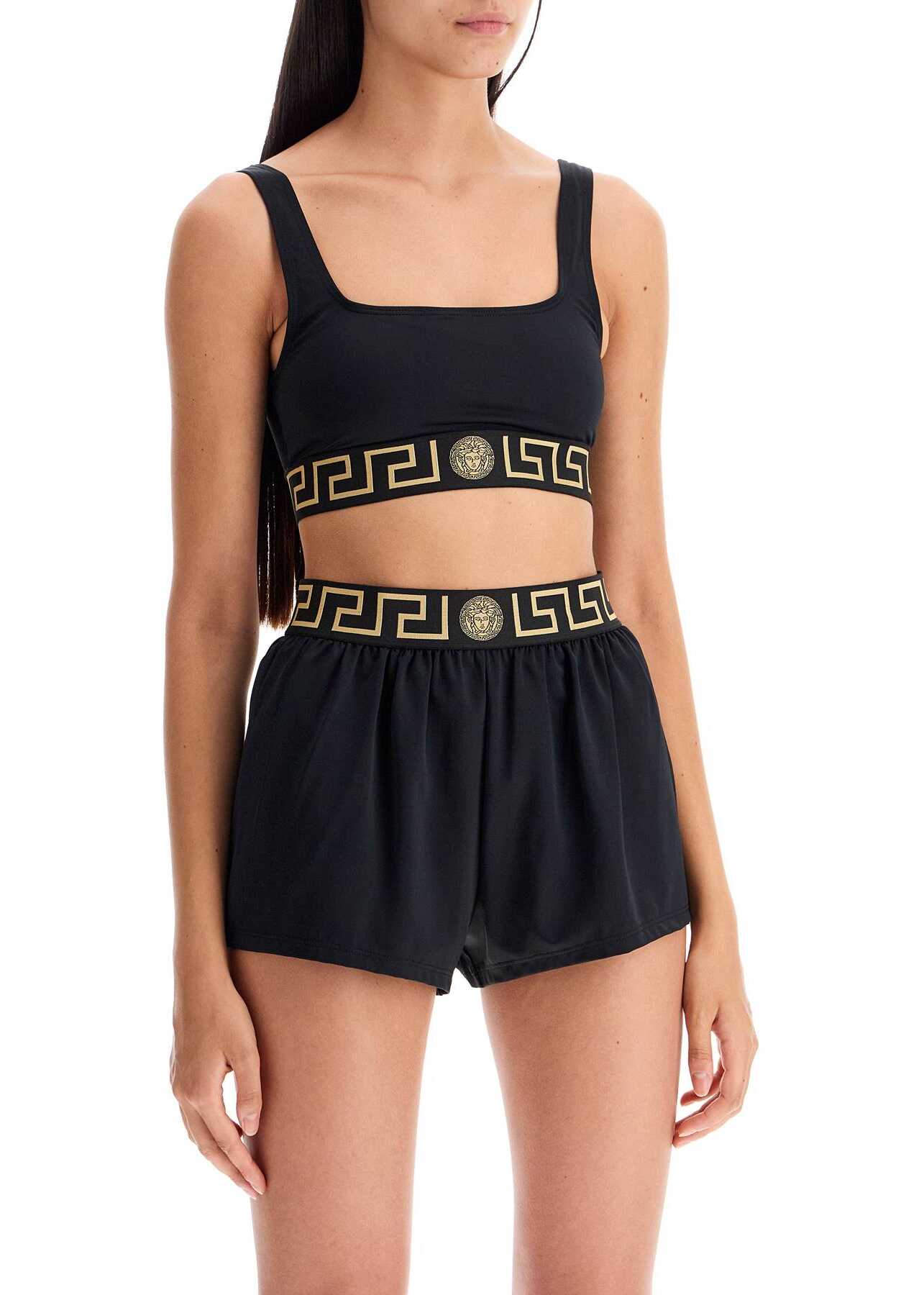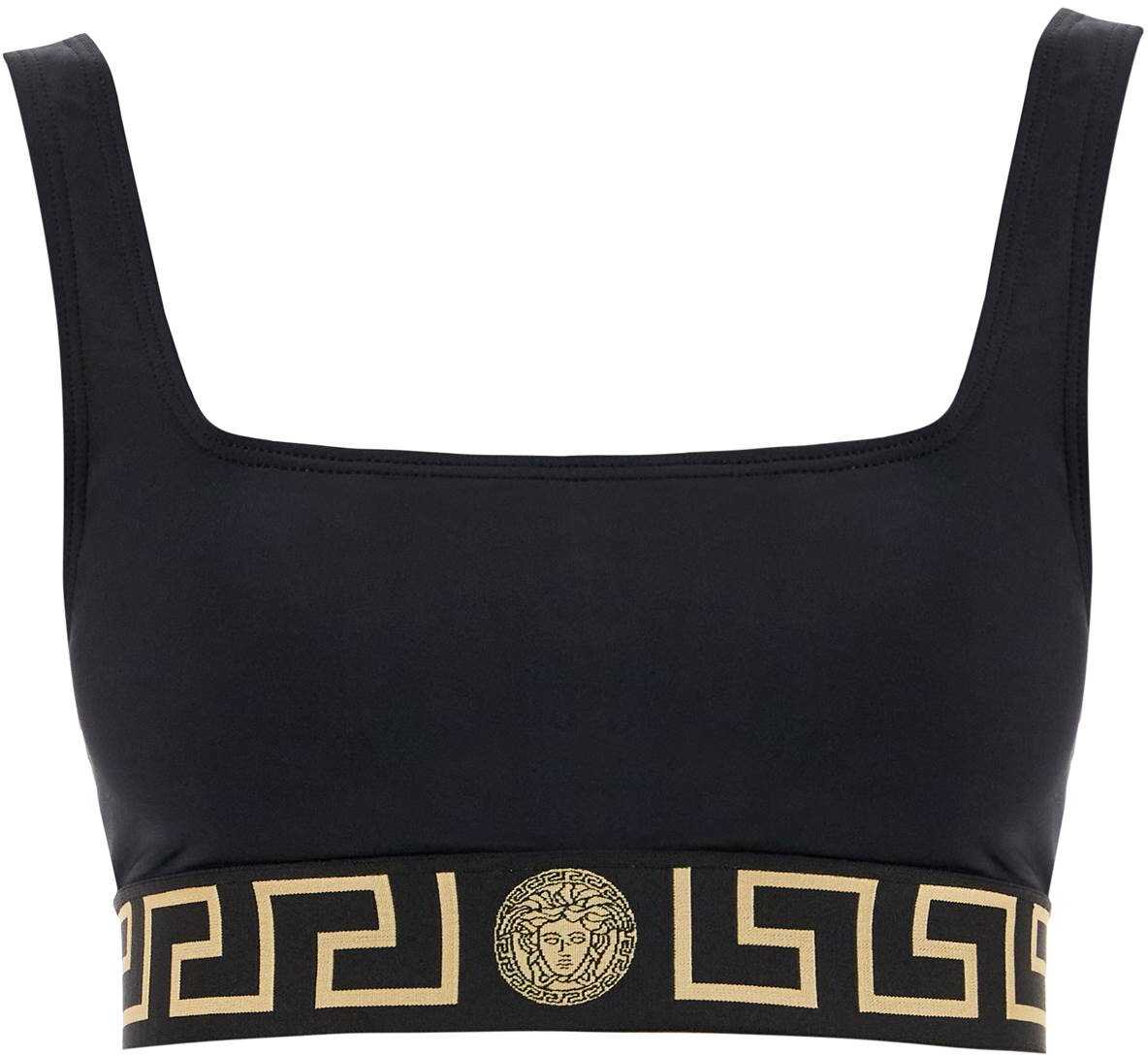This top bikini in lycra by Versace features a square neckline on the front and back, as well as an elastic band with Greca and Medusa motifs at the bottom. The model is 177 cm tall and wears size 1.