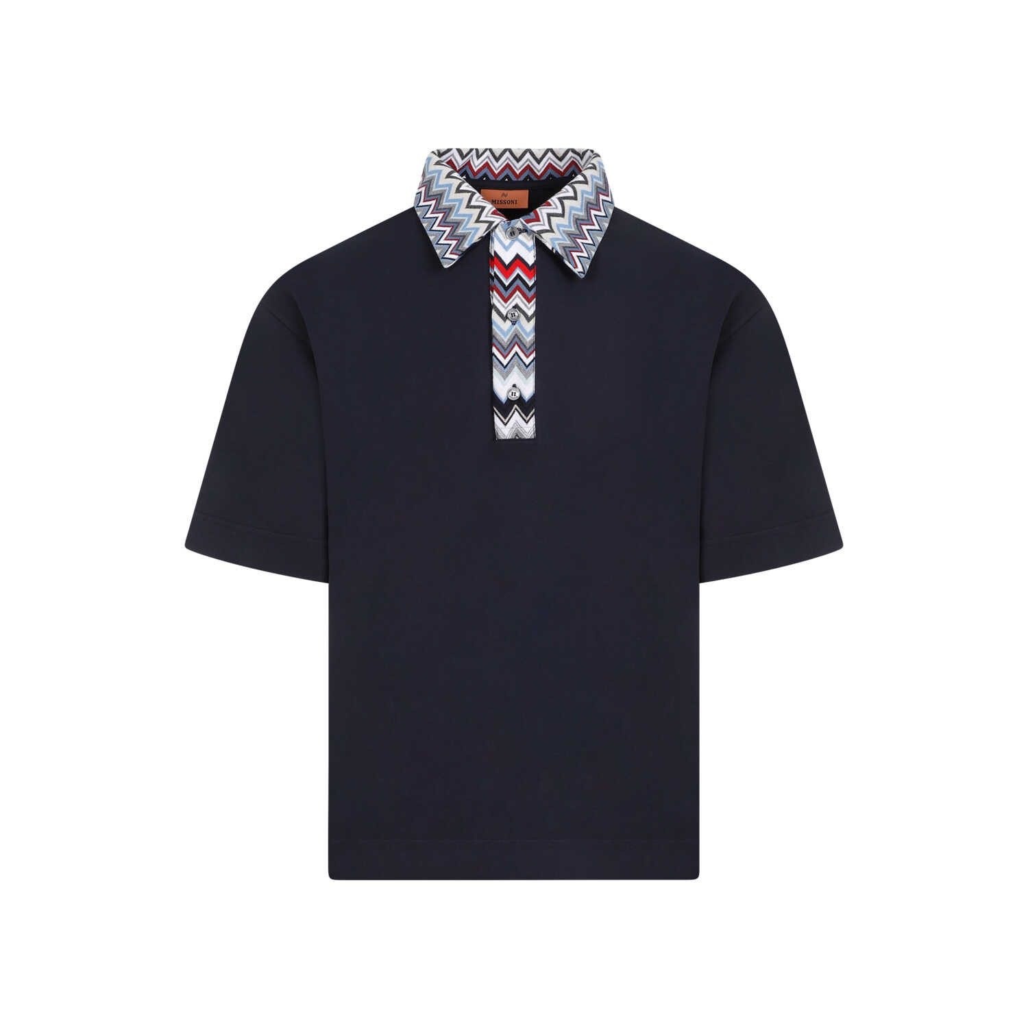 Missoni Blue Navy Cotton Polo. Pure blue navy cotton polo, classic polo collar with signature multicolor trims, short sleeves, straight hem.