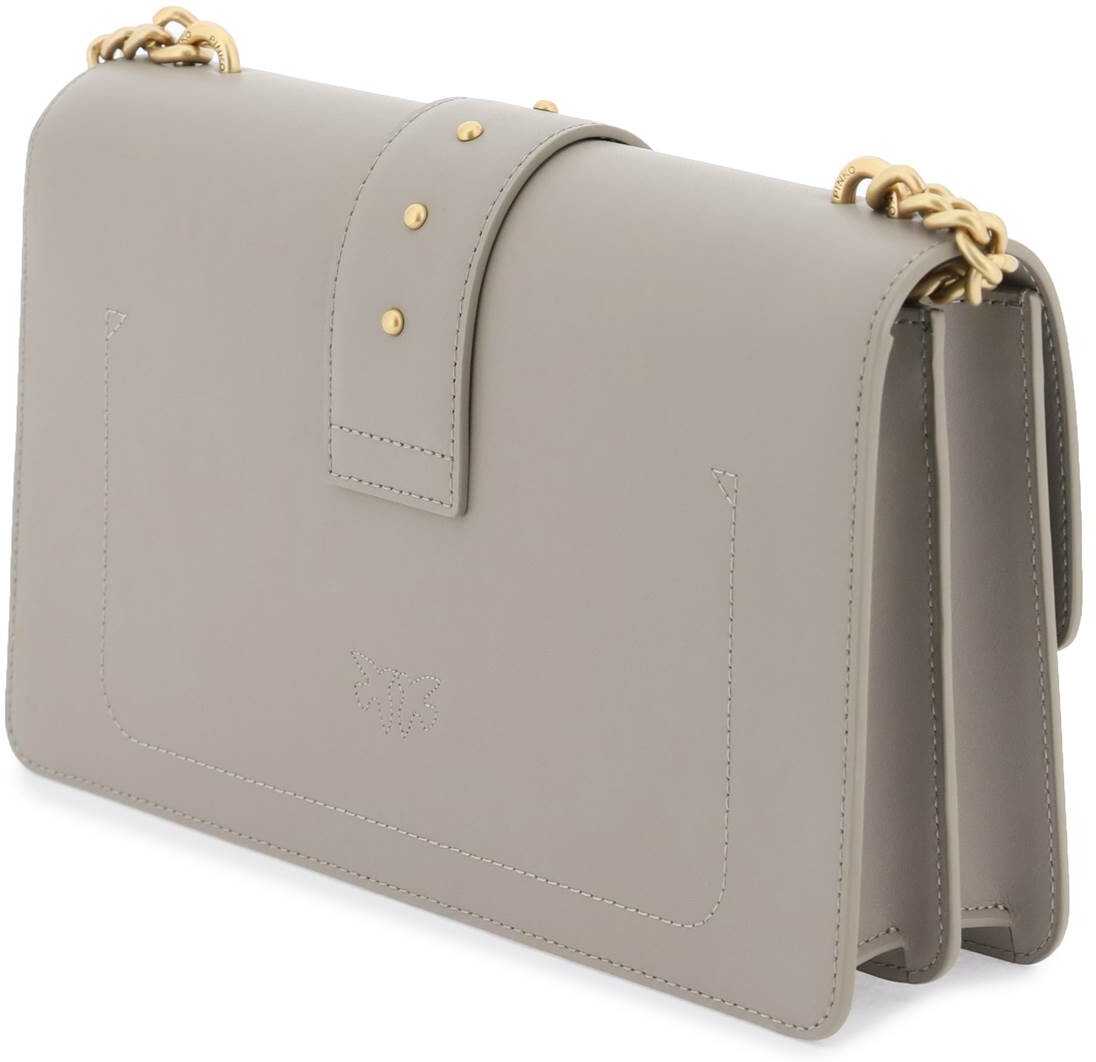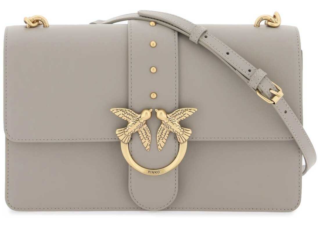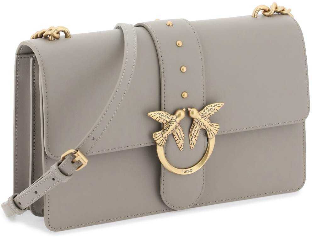 Classic Love Icon Simply bag by Pinko crafted in smooth calf leather and characterized by the front flap with Love Birds metal buckle and rounded studs. Removable and adjustable leather shoulder strap with side chain inserts, joint closure and Birds embroidery on the back. Interior lined in suede microfibre with one leather flat pocket and two compartments divided by a middle zipped pocket. Antique gold finish metalware.