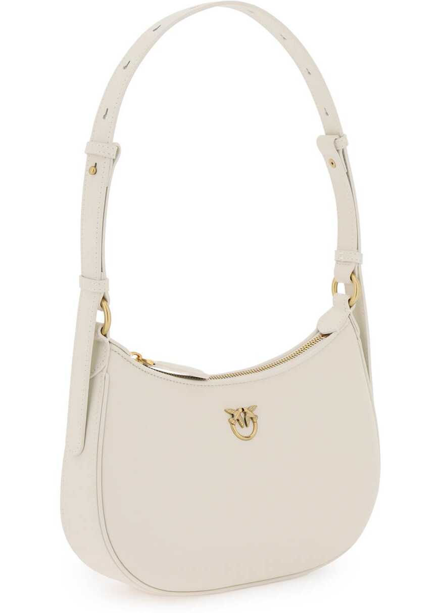 Leather shoulder bag by Pinko with a distinctive half-moon shape and iconic Love Birds appliqué. Zippered closure, microfiber suede interior with one zippered pocket and adjustable handle. Antiqued gold-finished metalware.