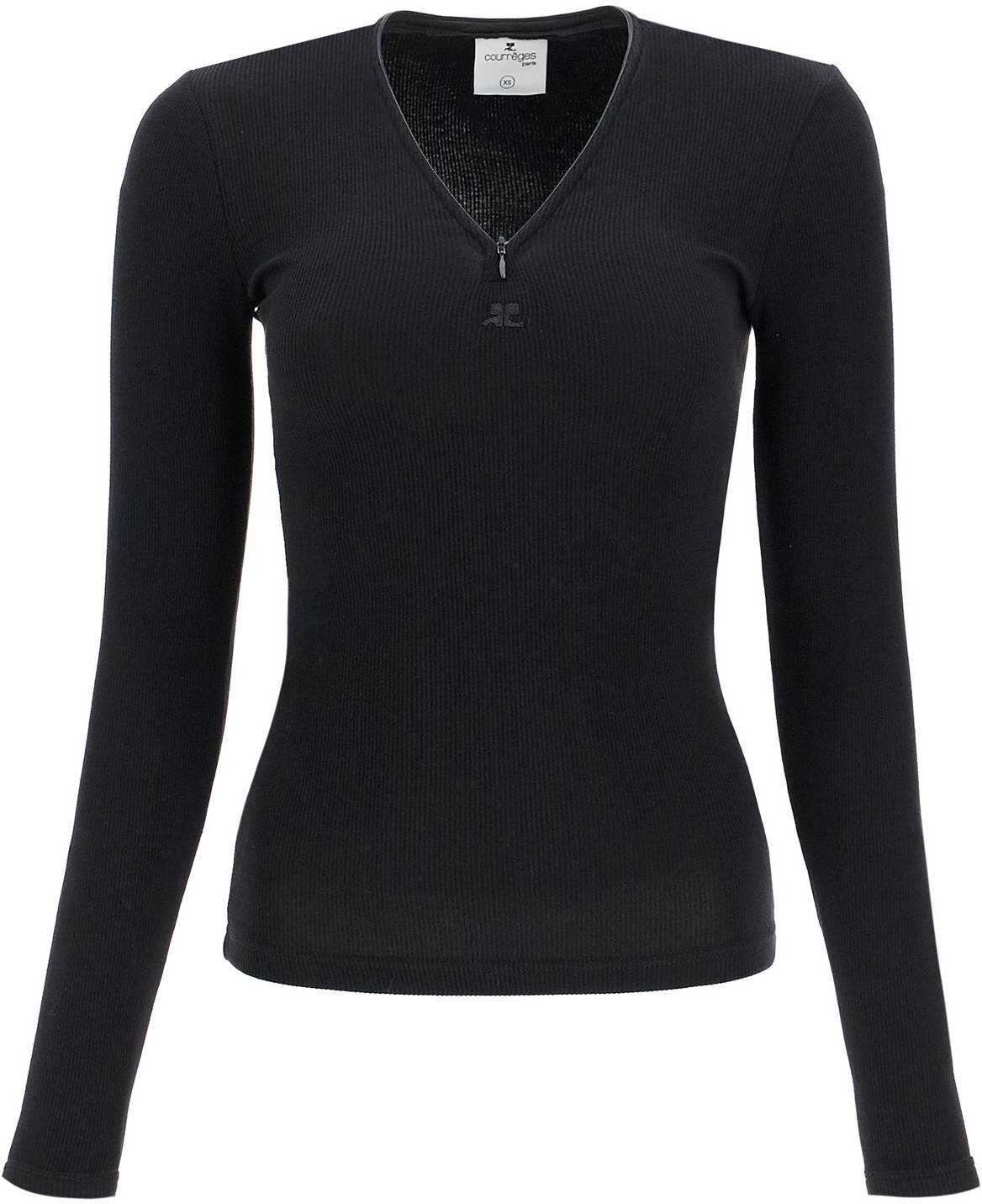 This long-sleeved Courrèges top is made of ribbed stretch cotton jersey and features a tonal AC logo patch under the V-neckline with a full zip. The fit is snug. The model is 177 cm tall and wears size XS.