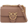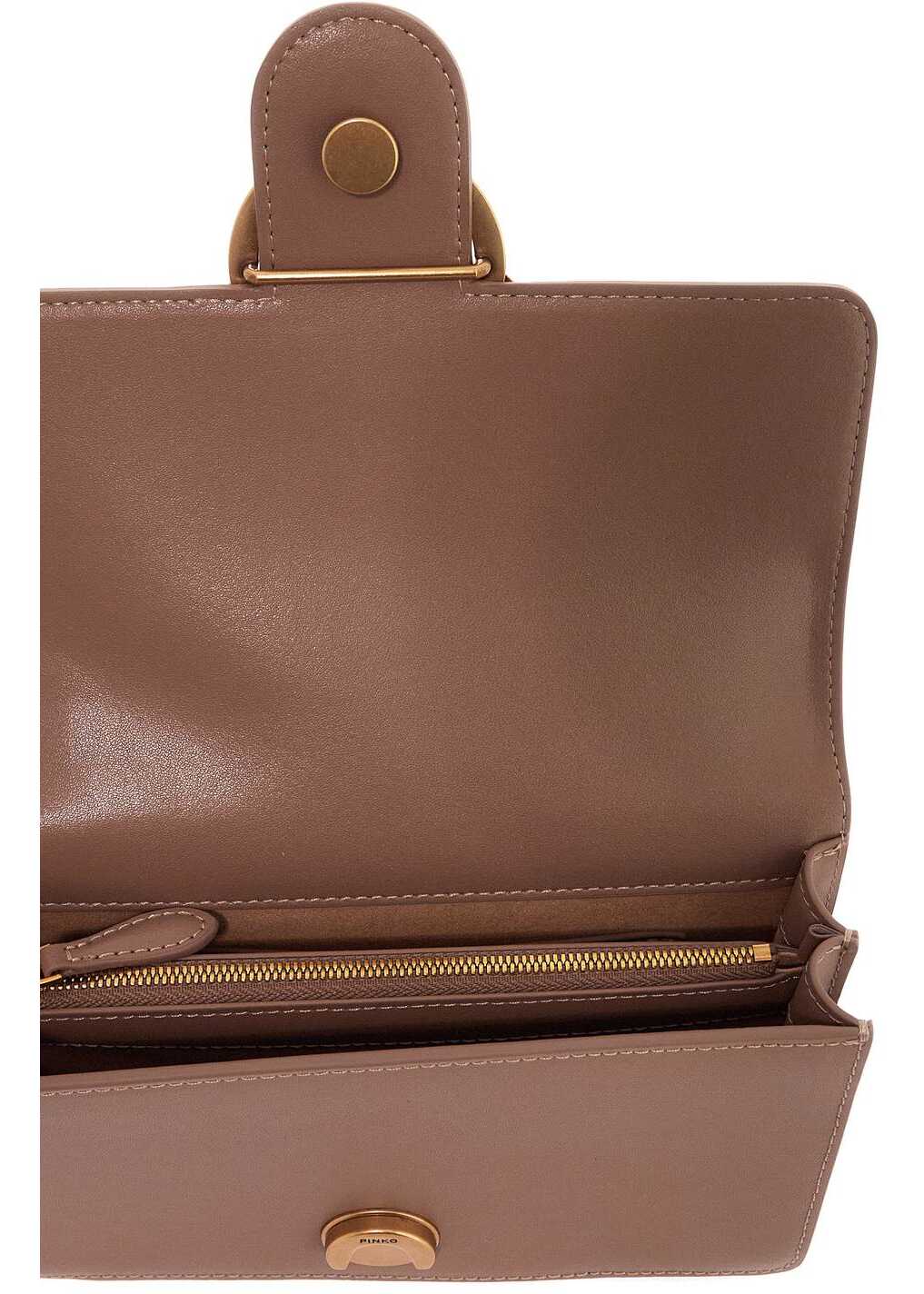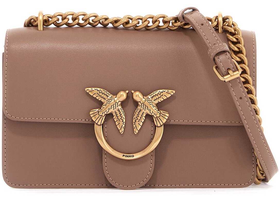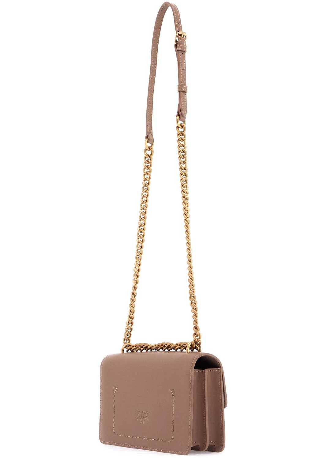 The Mini Love Bag One shoulder bag by Pinko is made of soft silk hand leather with iconic Love Birds Diamond Cut metal appliqués on the flap. It features a snap closure, and the interior is lined with microfiber suede and includes a closed compartment with zipper and an open leather pocket. The strap combines a classic round chain with a practical adjustable leather shoulder strap. The metallic accessories are in antique gold.