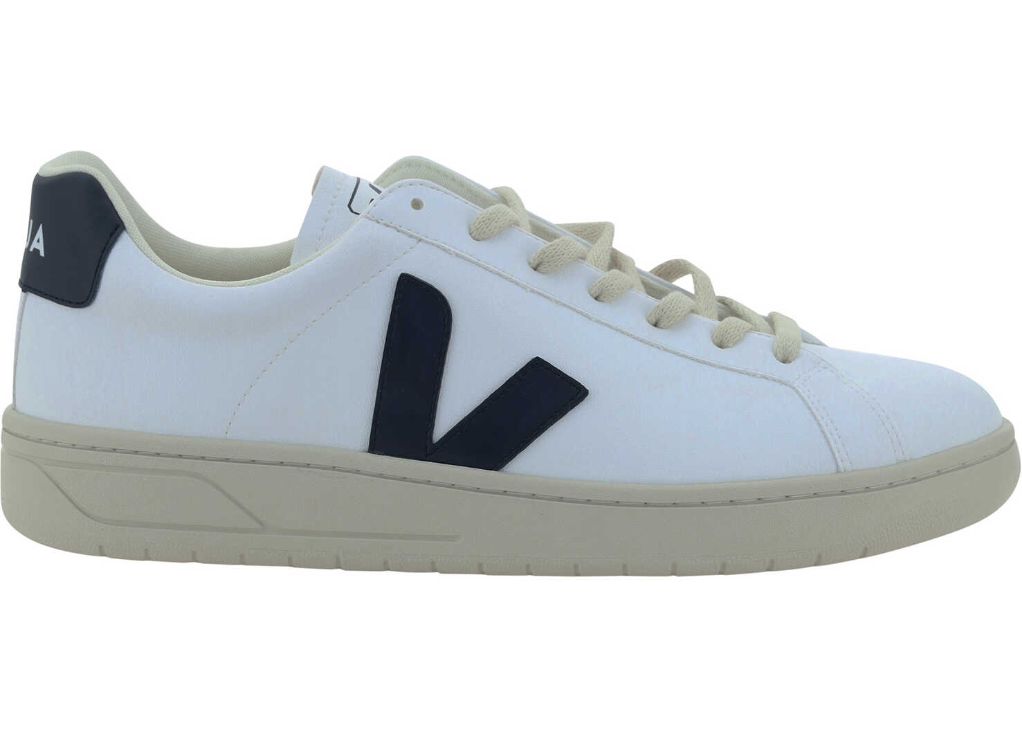 Calfskin Urca Sneakers by Veja, round toe, contrasting panel details, contrasting iconic brand logo applique on side panels, front lace-up closure, embossed logo tab, logo applique on tongue, contrasting heel reinforcement.