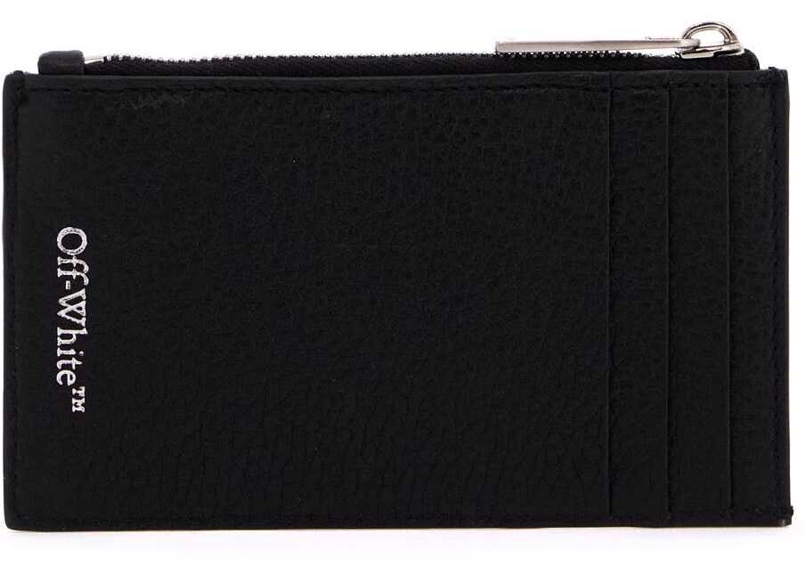The Off-White card holder is made of hammered leather with iconic embossed diagonals on the front and laminated logo lettering on the back. It features a main zip compartment lined in fabric, a flat front pocket, and three card slots on the back.