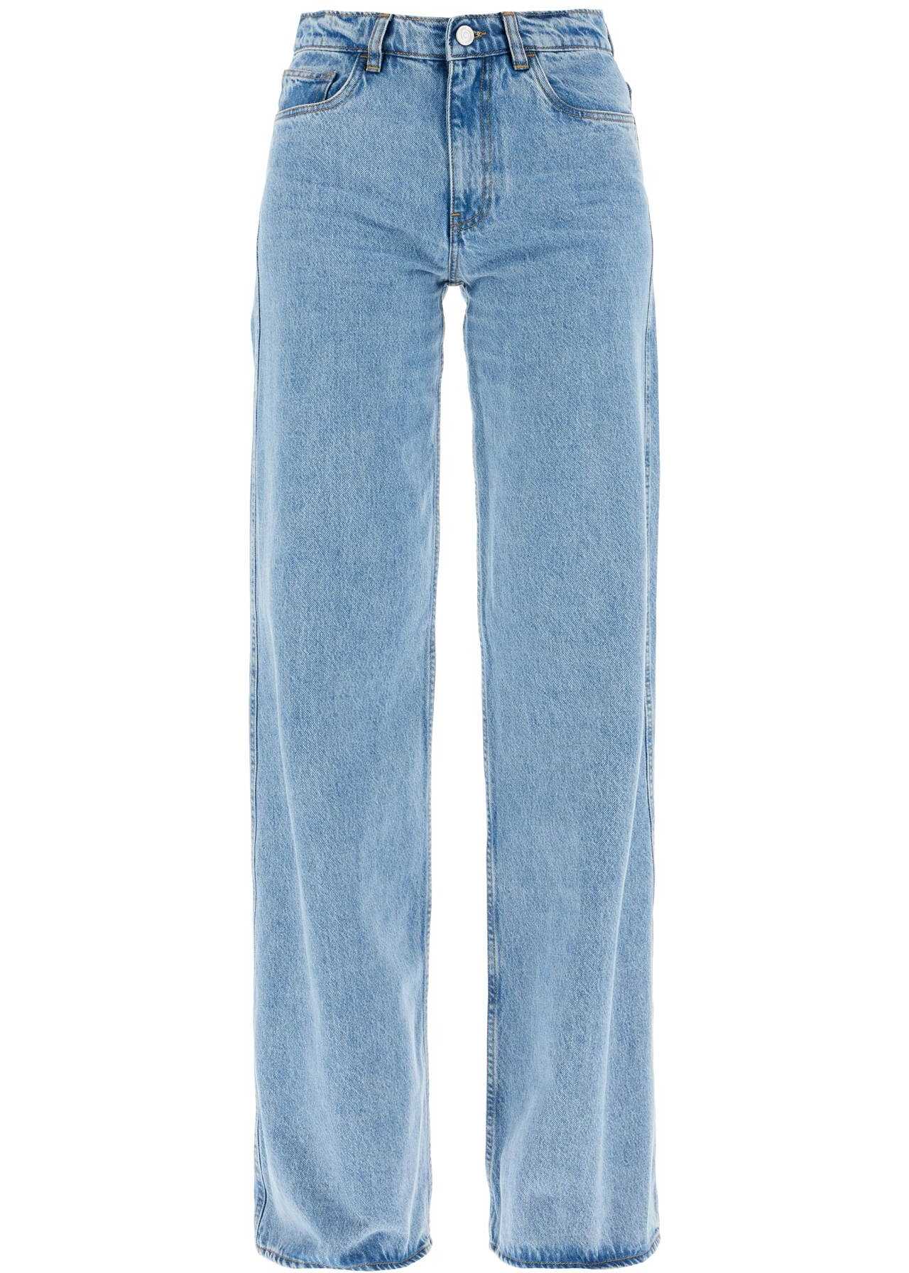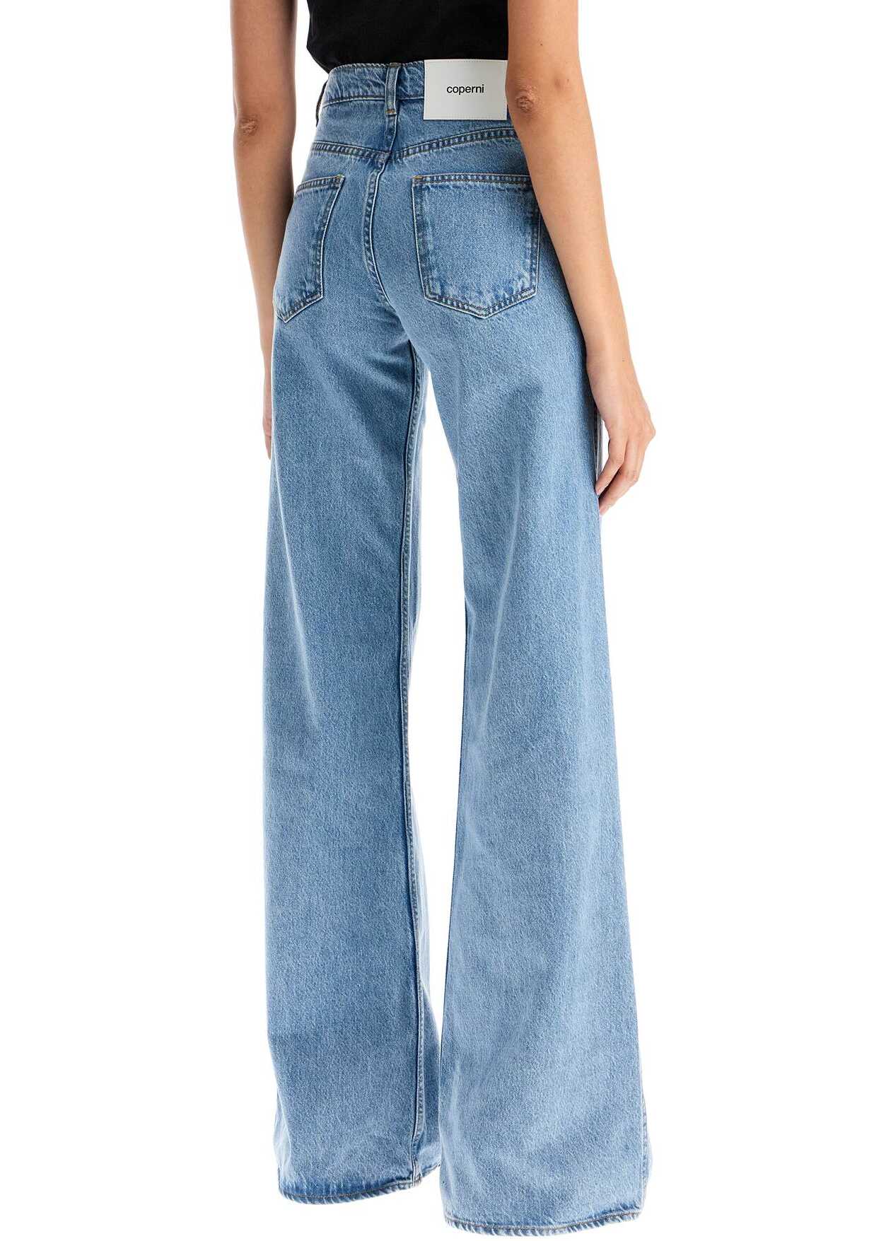 Coperni's jeans are made of pure cotton denim with a light wash, featuring a five-pocket design and a wide flared cut enhanced by a high waist. They have a button and concealed zip closure, belt loops, and a branded jacron patch on the back waist. The model is 177 cm tall and wears a size XS.