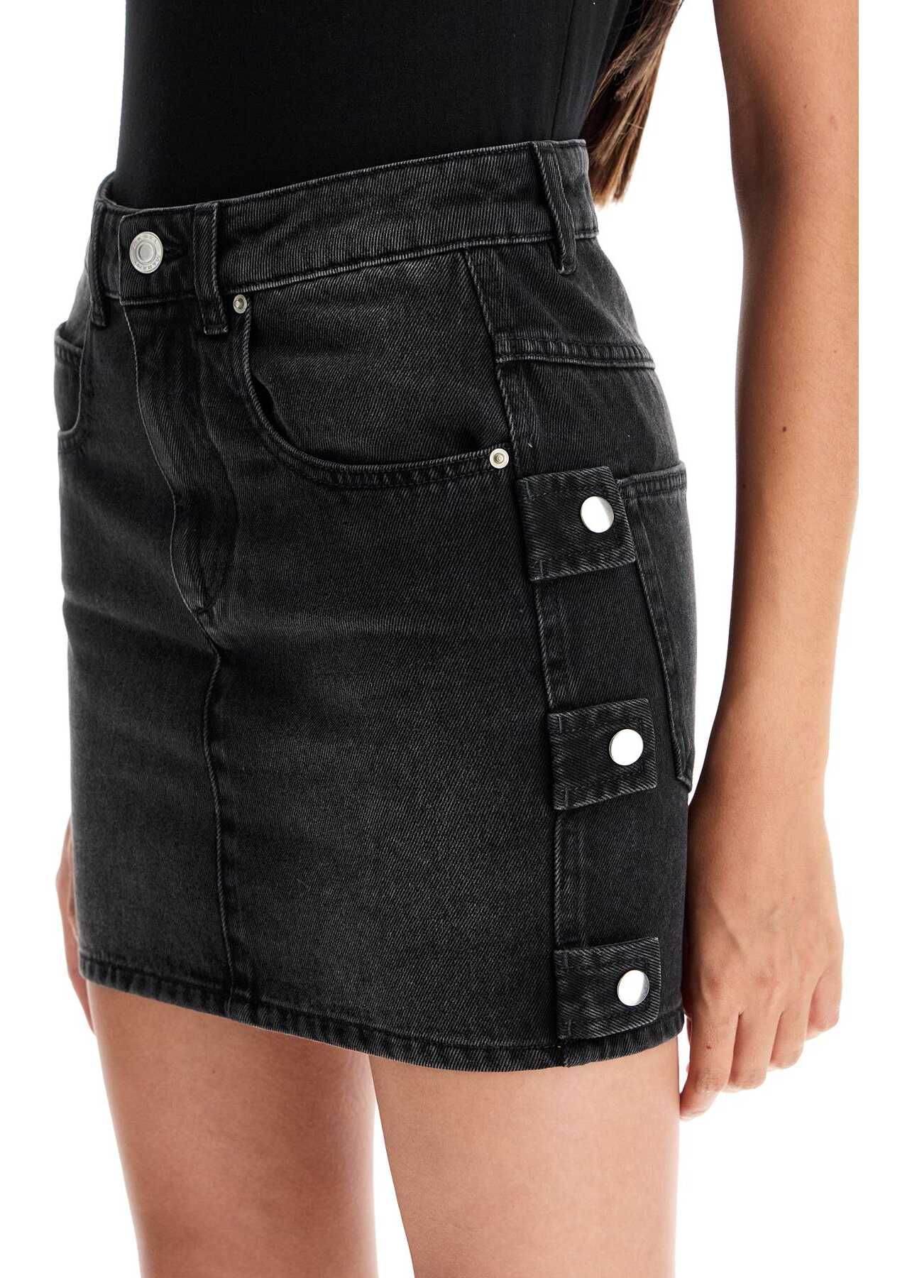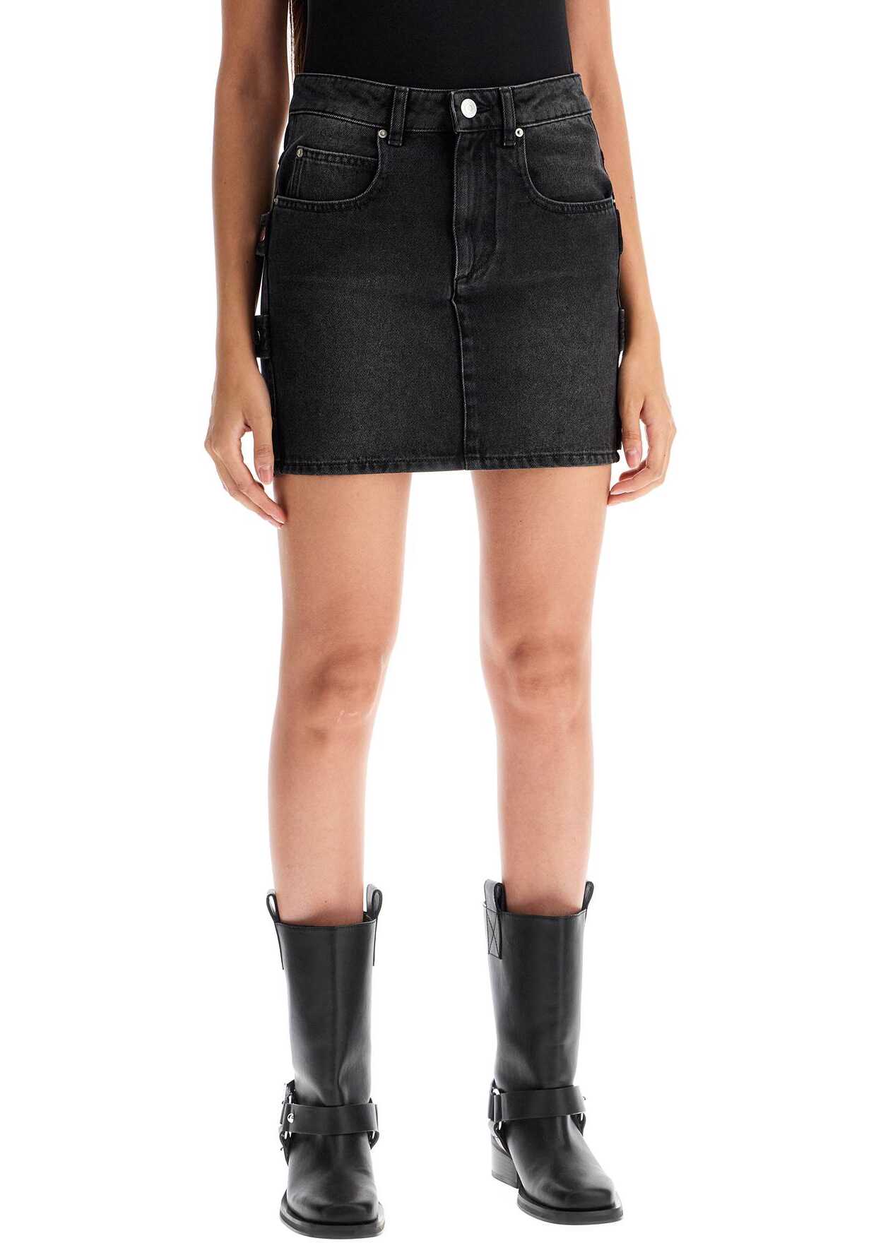 Marant Etoile's denim miniskirt is made of pure organic cotton with a faded effect, featuring a five-pocket design embellished on the hips with snap tabs. It has a front button and concealed zip closure, belt loops, and a branded tab at the back waist. The cut is straight with a slim fit. The model is 177 cm tall and wears a size FR 34.