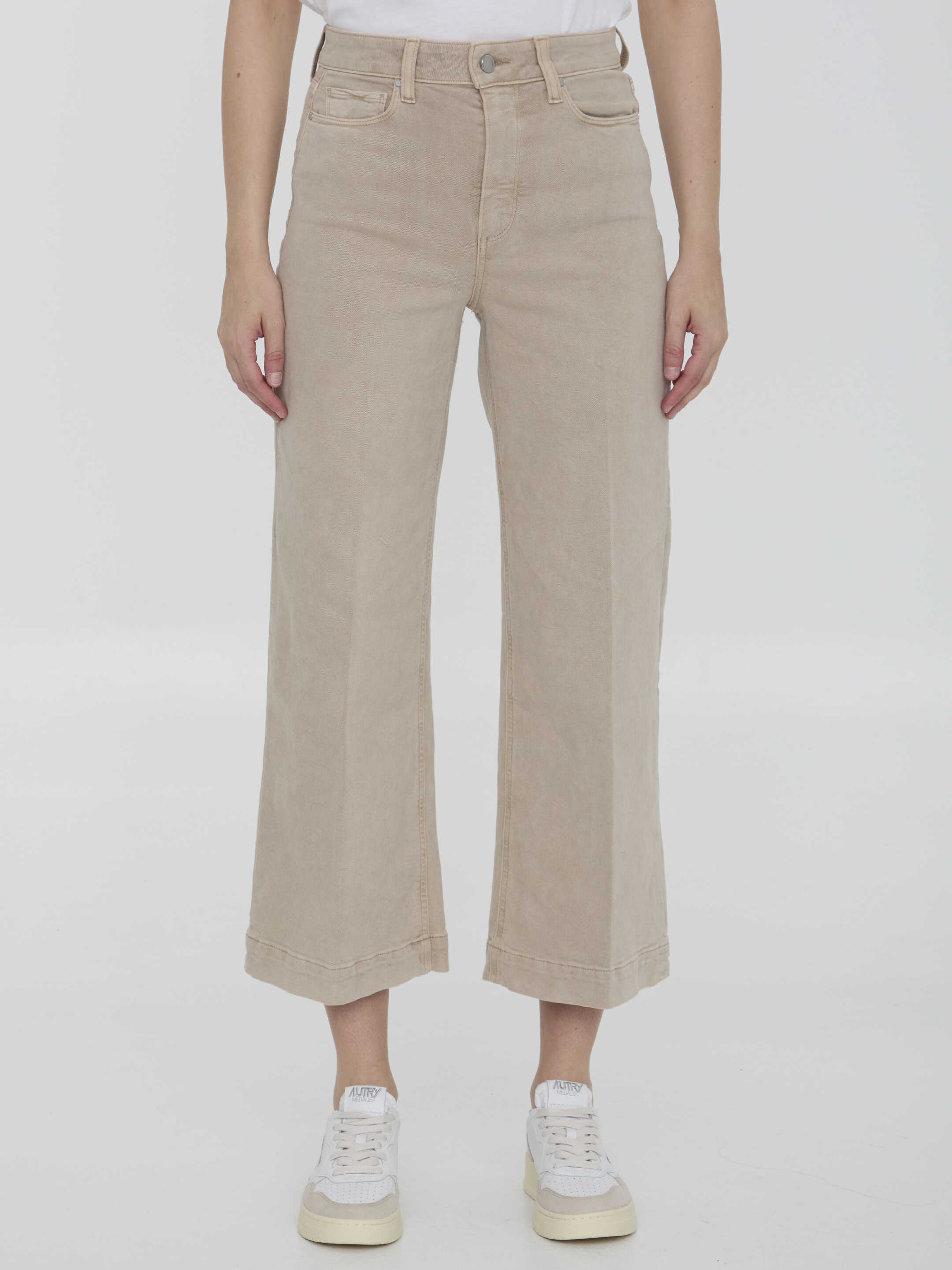 Wide-leg ankle-cut Anessa jeans in sand-colored cotton denim. It features zip and button closure, five-pocket design, belt loops and Paige leather patch at the back. Regular fit.