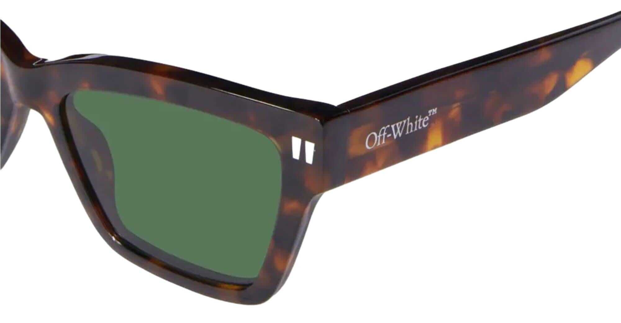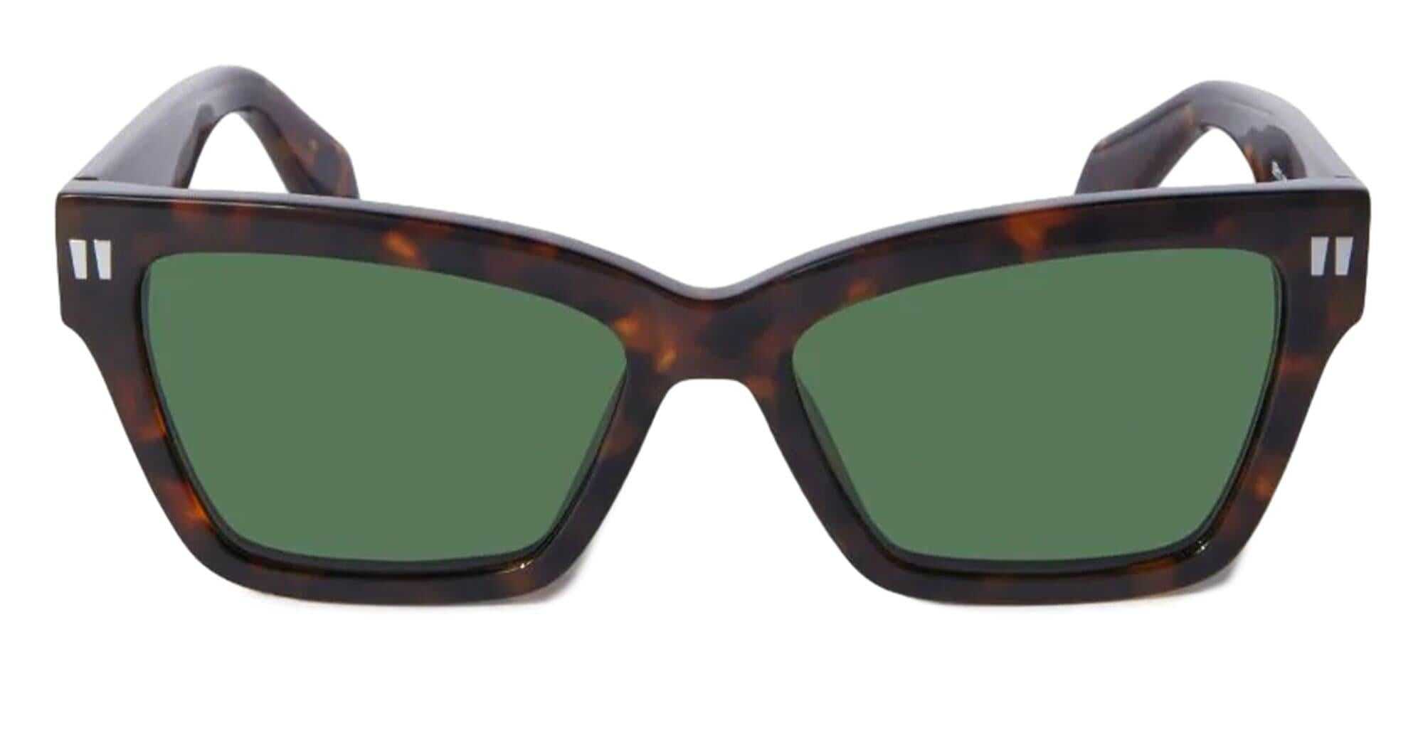 OFF-WHITE CINCINNATI - HAVANA / GREEN (OERI110S24PLA0016055) are cat-eye sunglasses with a geometric silhouette. They feature brown havana acetate frame, thicker top edge, signature quotation mark front pins, metal logo on temples, and green lens with 100% UV protection.