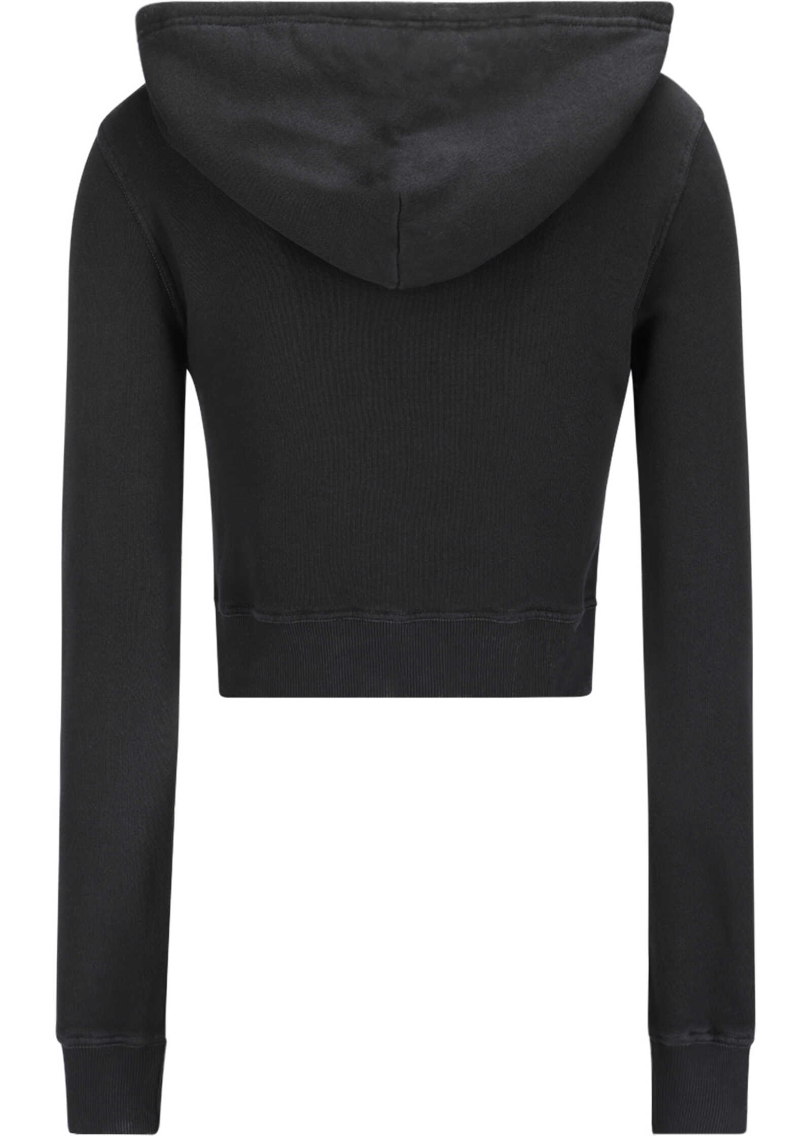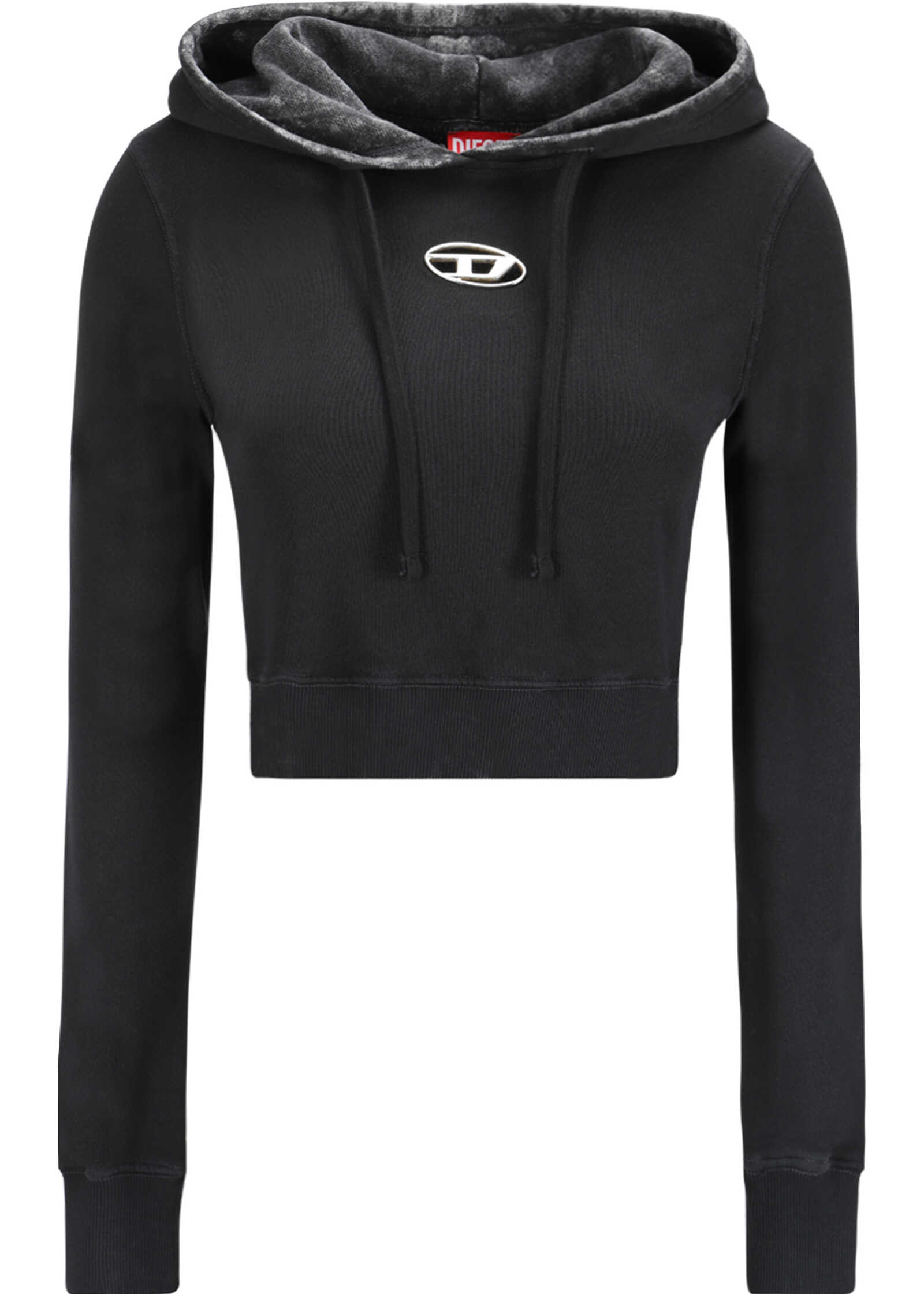 Cotton Hoodie by Diesel, cropped pattern, adjustable drawstring hood, ribbed cuffs, ribbed hem, cut-out detail on front with three-dimensional iconic brand logo plaque applique, monochrome pattern.