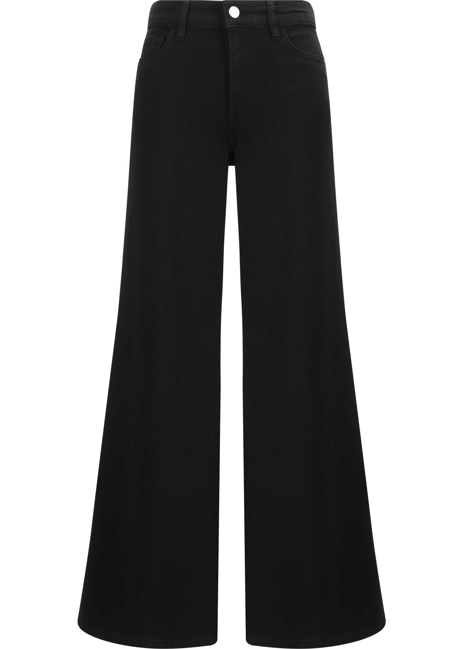 Cotton Le Palazzo Pants by Frame, five-pocket swide-leg style, denim design, front button and zipper closure, waistband loops, monochrome pattern.